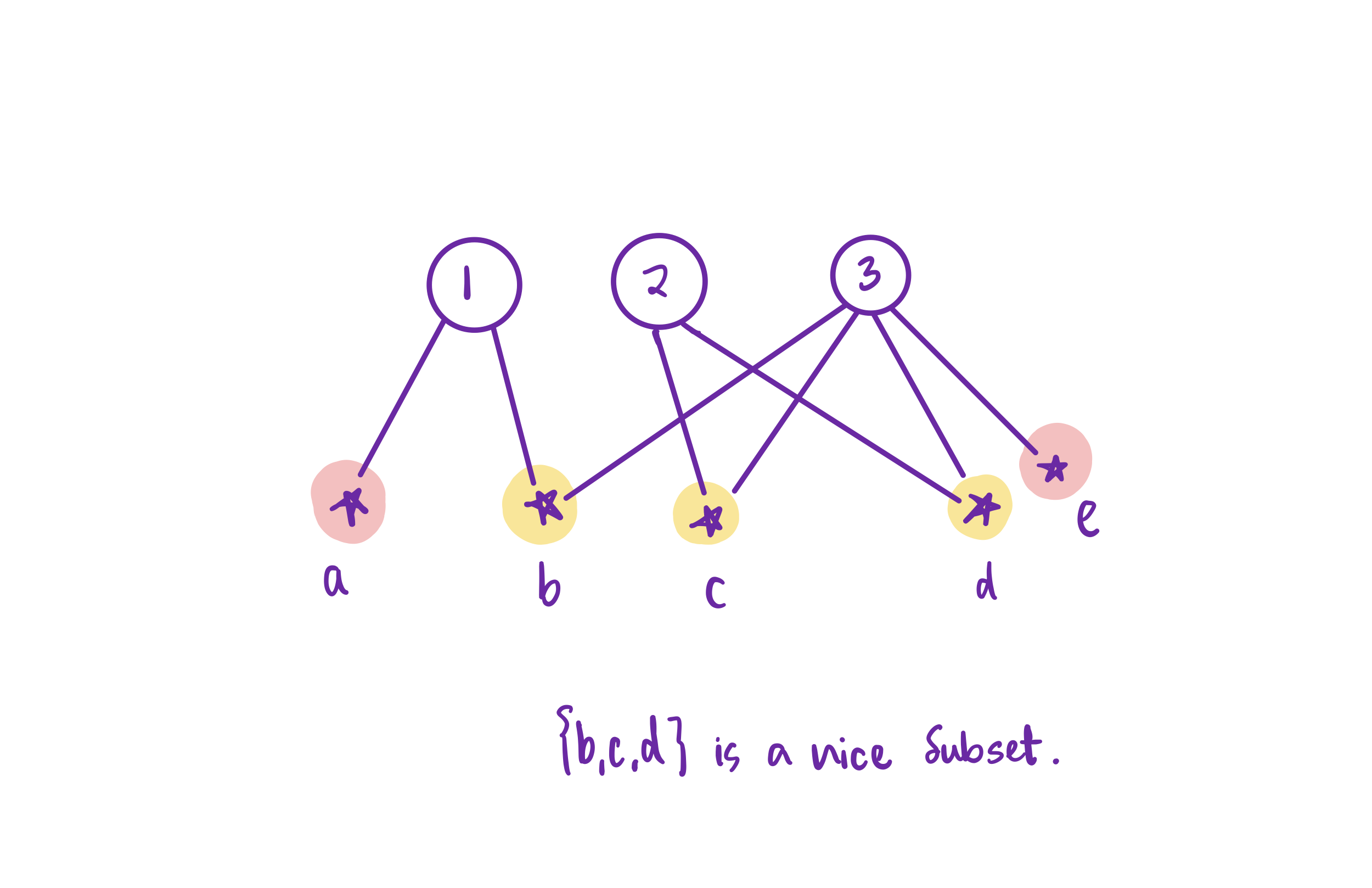 Some of the nodes in Y can be removed to leave a subset W \subseteq Y. A subset W is called nice with G if every node in X which has been assigned a number m is connected to exactly m nodes in W. An example of a nice set is in the image below.