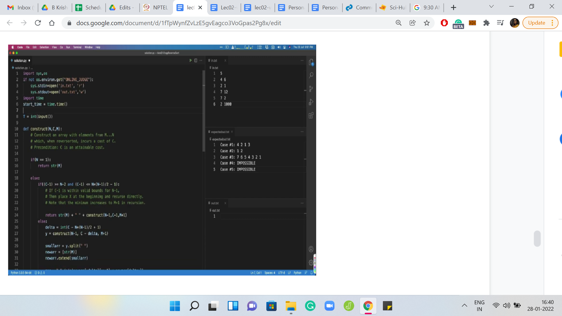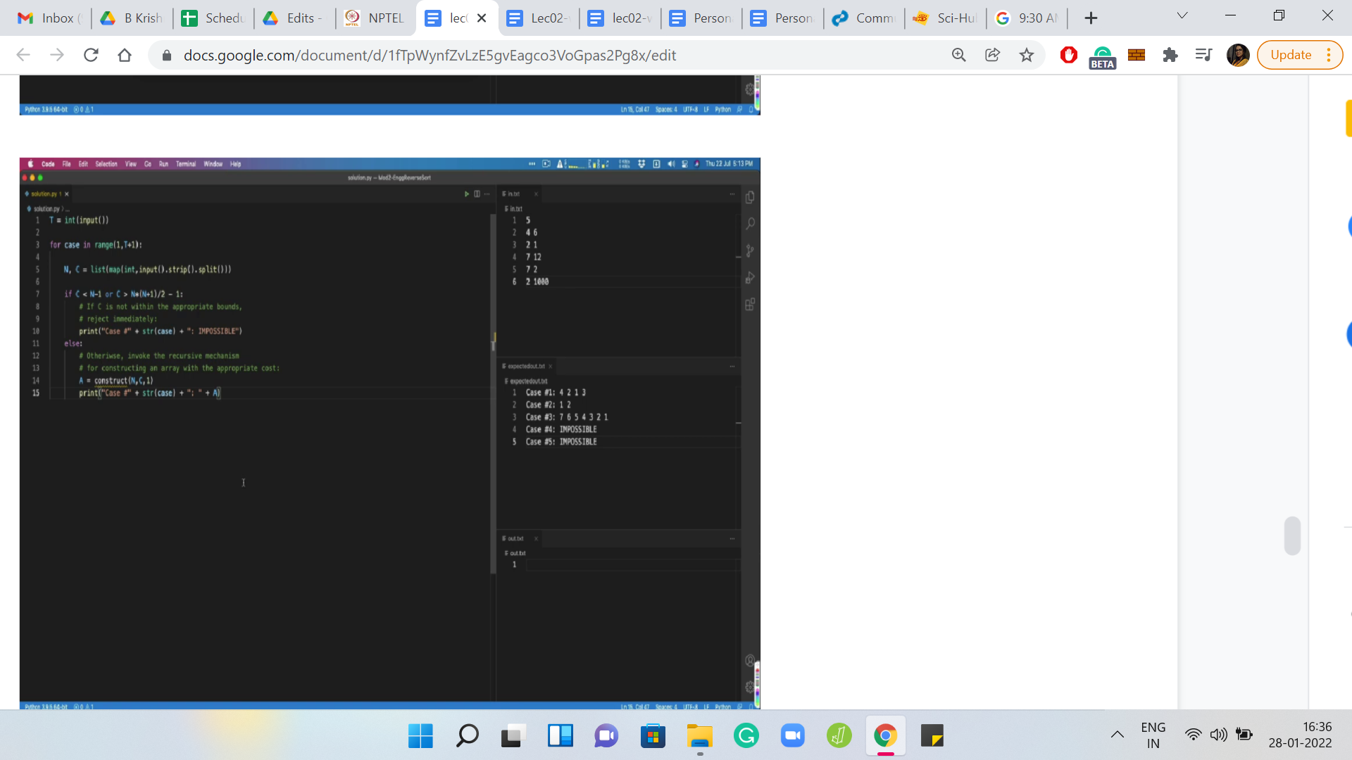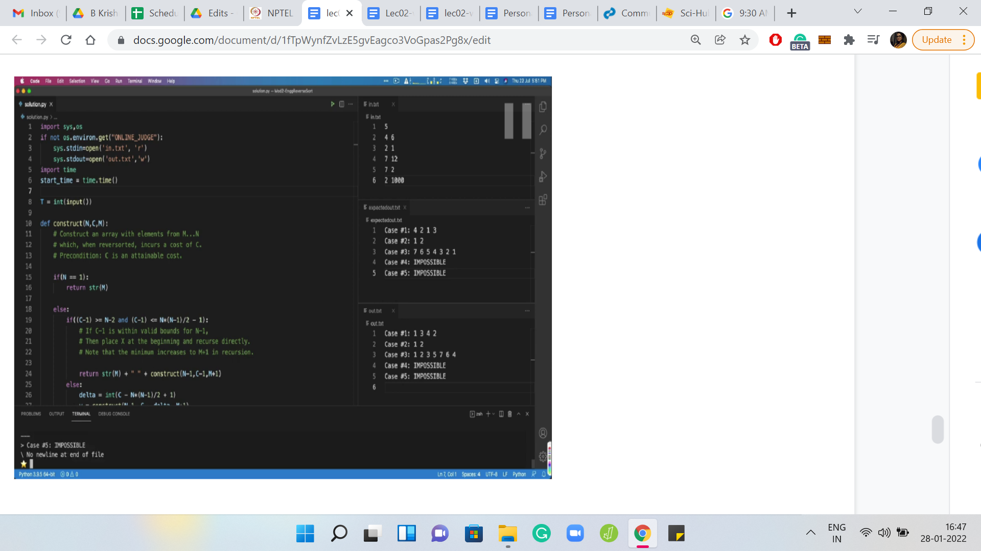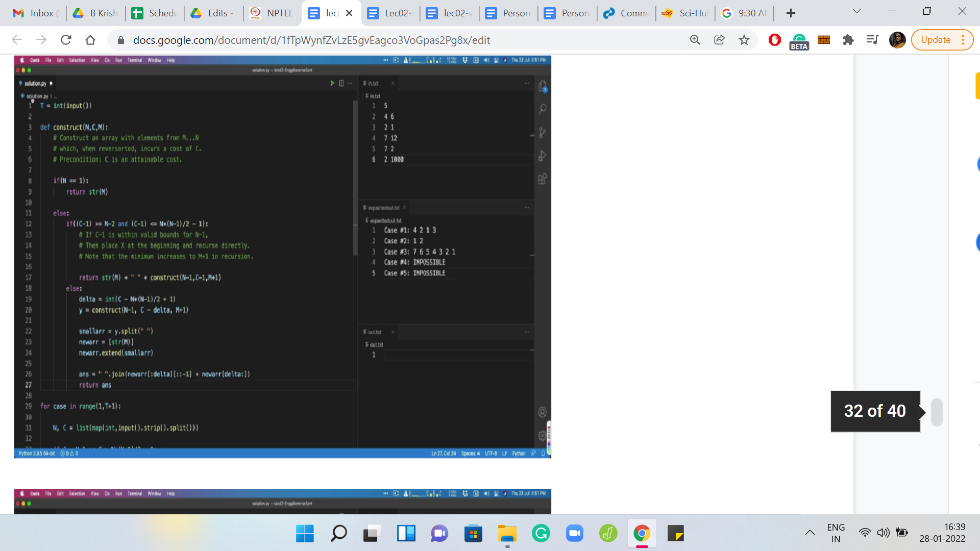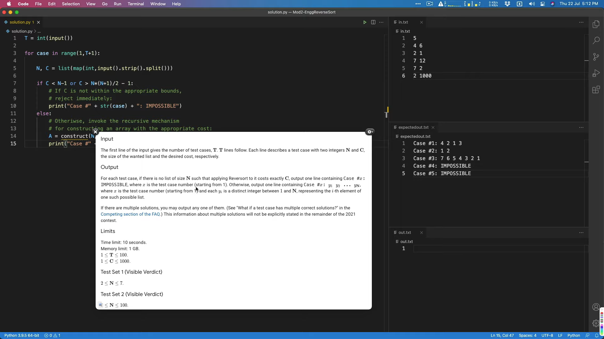 So, we have our usual setup here. As before, I have pulled in the values of the sample input and outputs for your reference in the files to the right. Now, the sample outputs for this problem are a bit different from usual, in the sense that it is not going to be a character-by-character match as it usually is for most problems. Notice that, for some values of N and C there might be multiple arrays of numbers between 1 and N whose cost is exactly C.