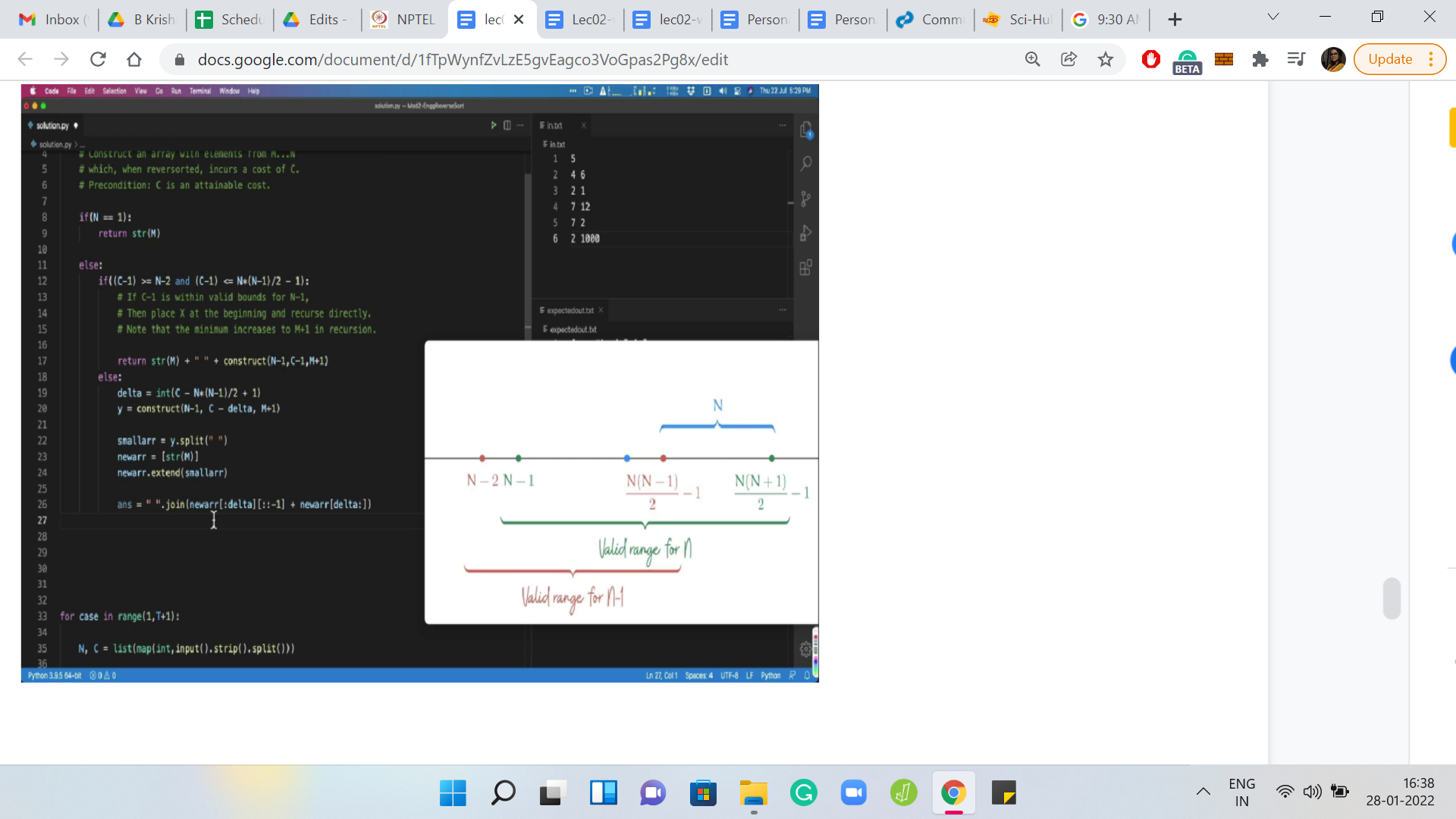 Just to save time, I am going to copy-paste this section of the code here and just take a look at what we are doing. So, we are saying that if C-1 is at least N-2, and C-1 is at most {[N(N-1)]/2}-1, then let us just invoke this function with length N-1 cost C-1 and of course, the minimum upgraded to N+1. We get this array, and then we just add the current minimum to the start of the array. In the beginning, this will be 1, but in a generic situation, you want to add the minimum element in the beginning and append the constructed array at the end.