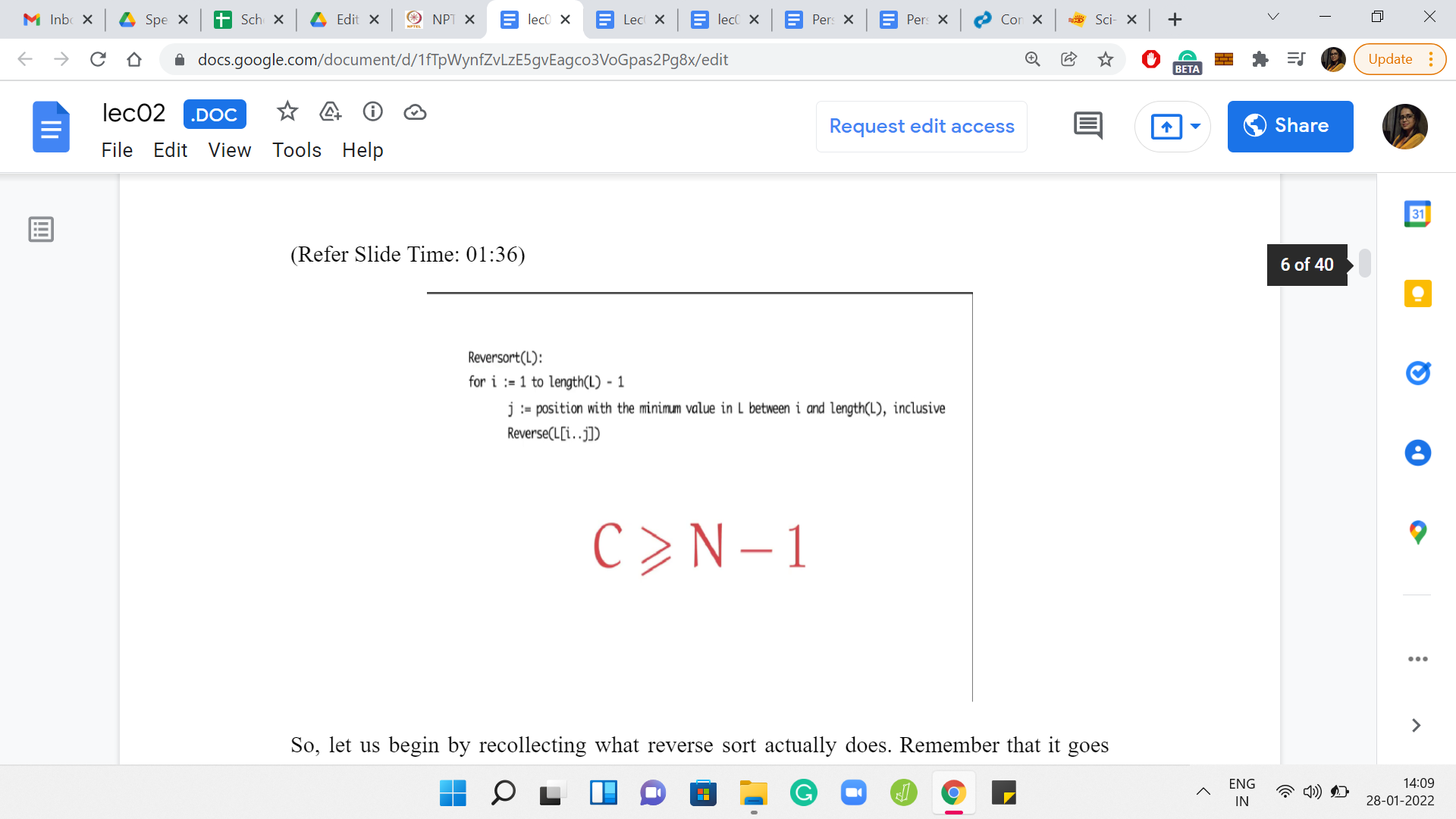 So you might notice that reversort has N-1 iterations and because of what we just said, the cost of every iteration is at least 1. There are no free lunches in this entire process at all. So, the cost of reversorting any array of length N is at least N-1. So, if the value of C is strictly less than N-1, then it is pretty safe to declare that there is no such list.