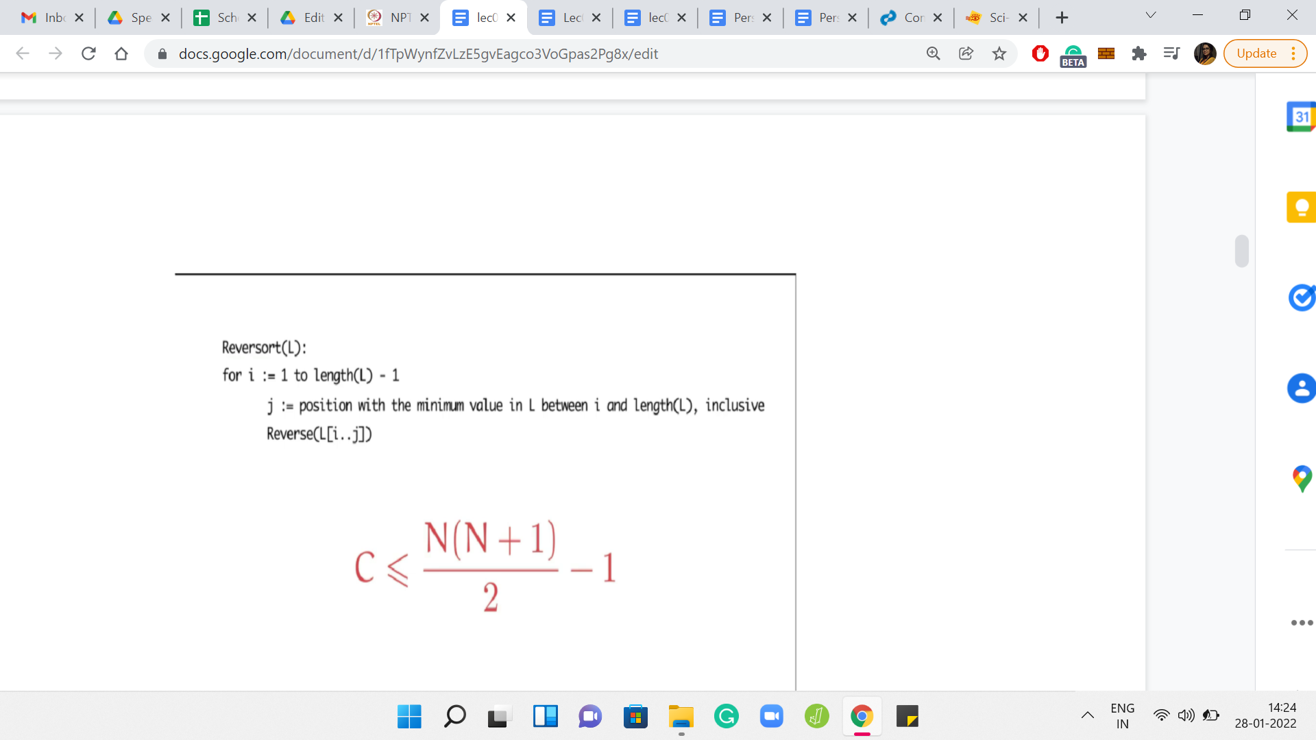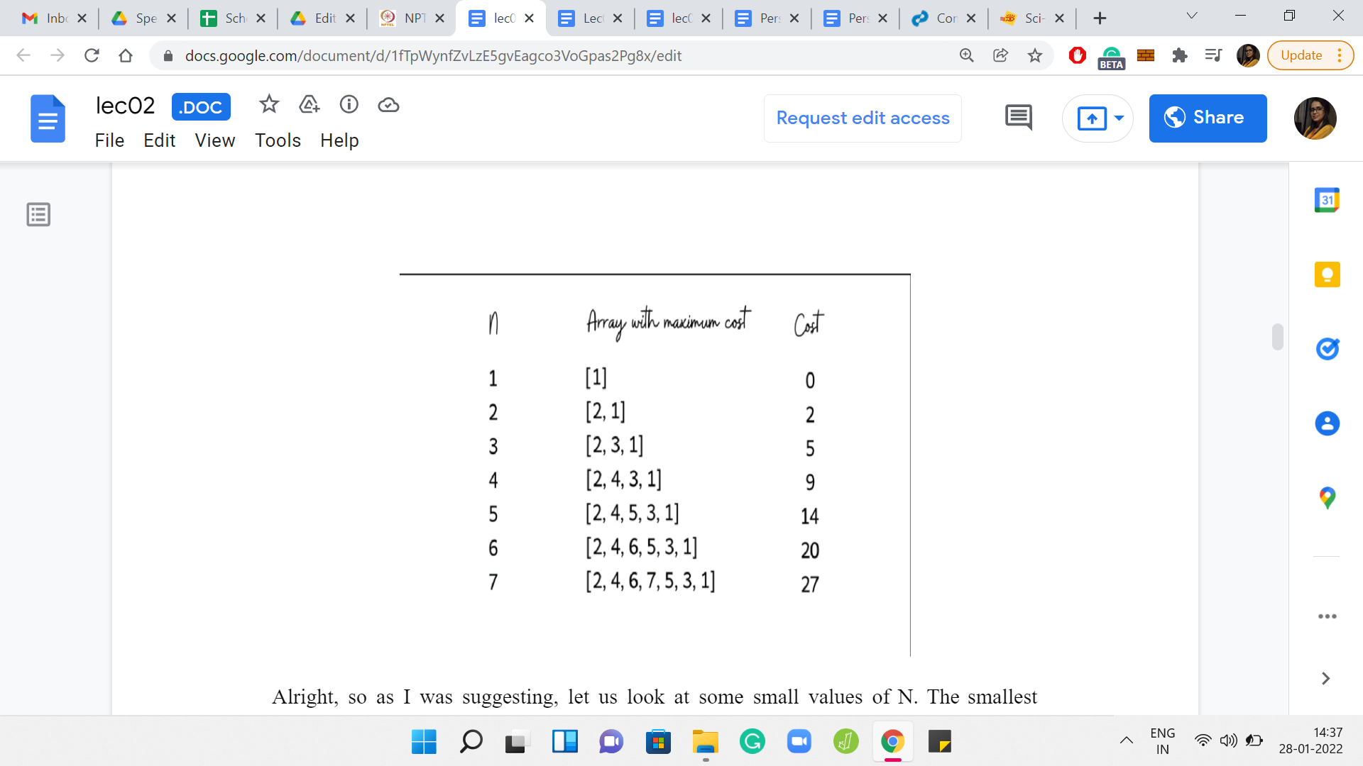 For a given N, can you come up with a list of numbers from 1 to N, whose cost of getting reversorted is exactly the expression that you see here? Feel free to try this out for some small values of N. I will say that this question is slightly harder than the question of coming up with a list whose cost was exactly N-1. So, take your time and come back to this lecture when you are ready.