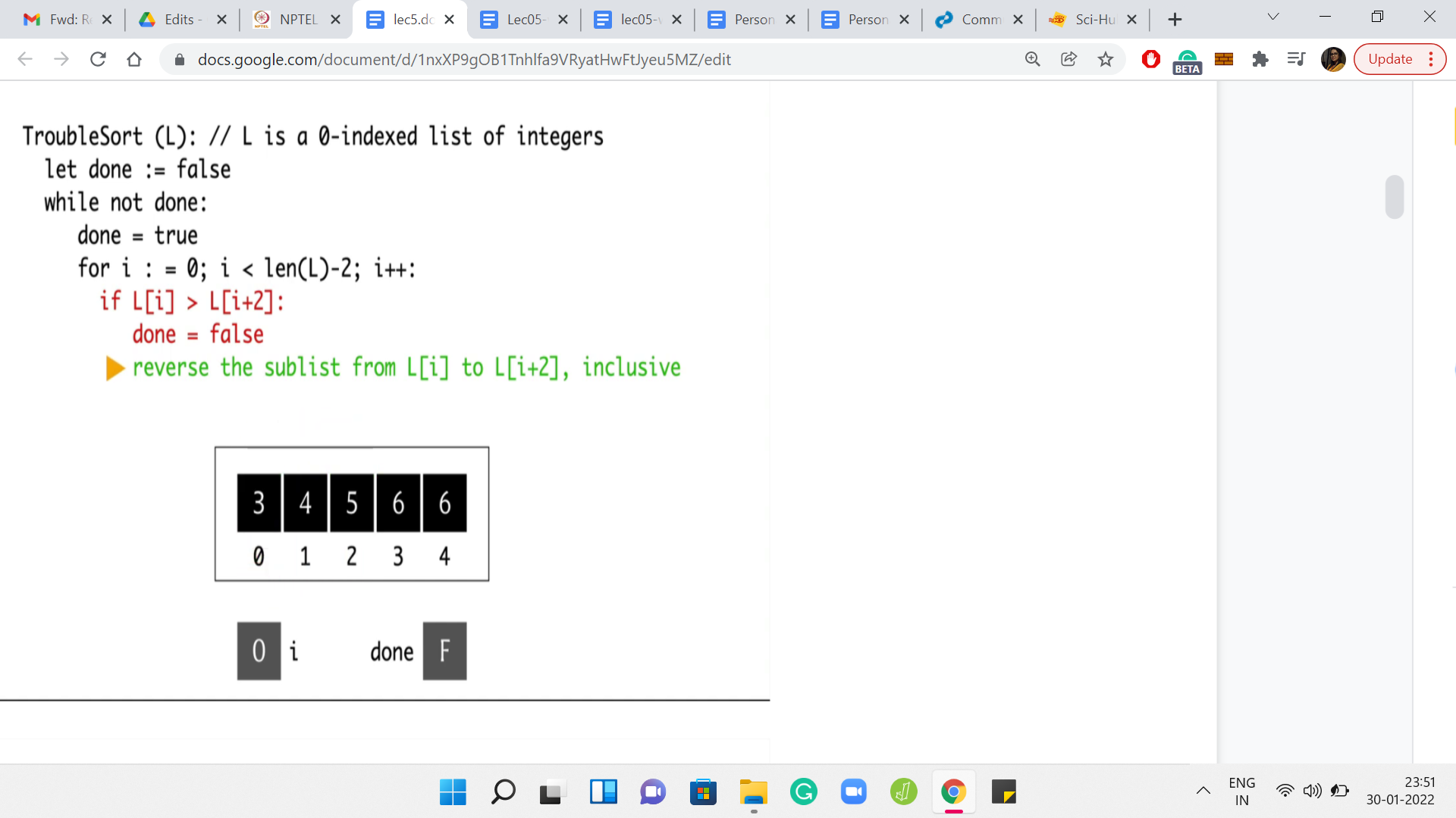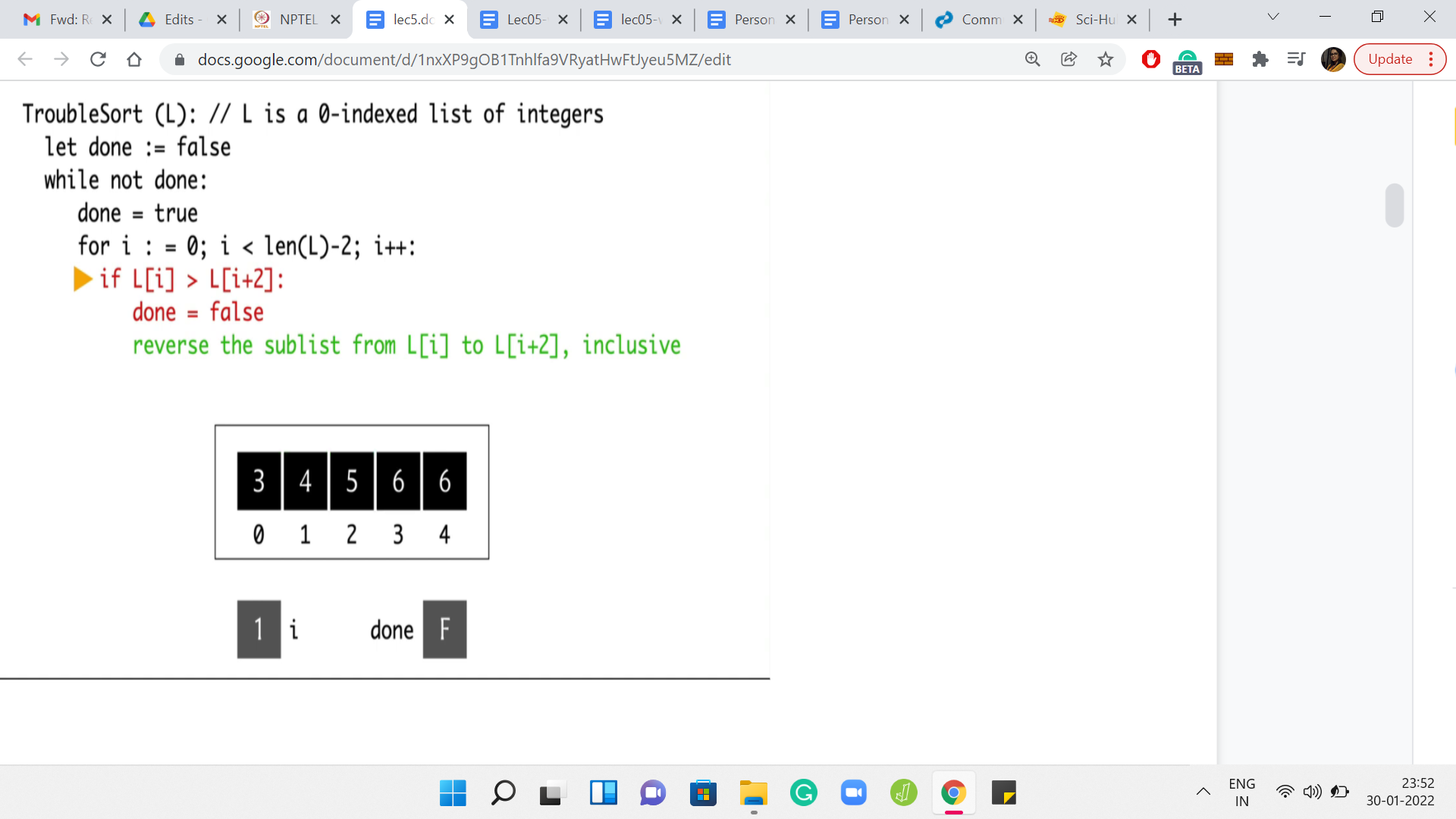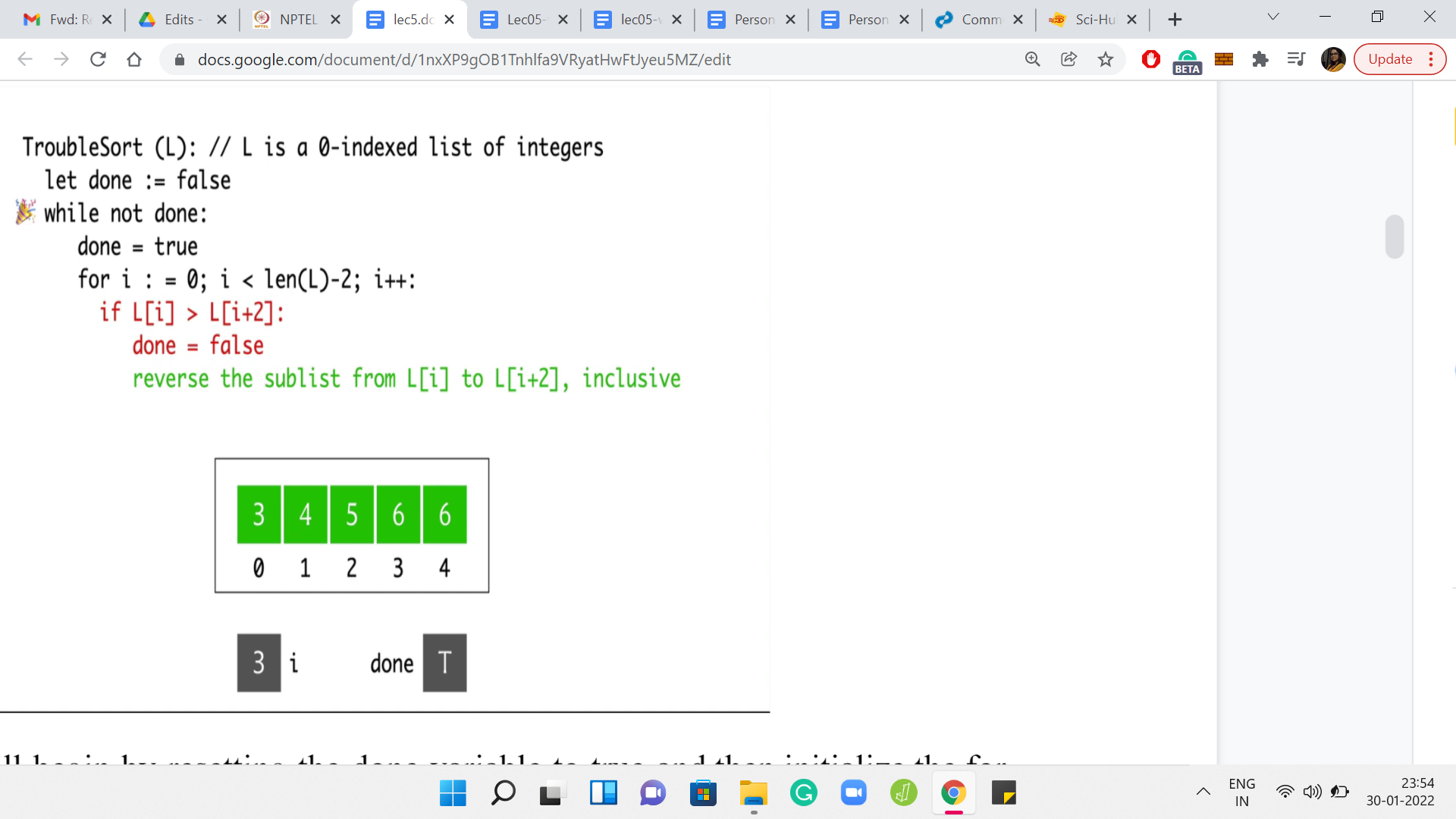 So, I am using n to denote Len of L. What happens in the ith iteration is that you compare the elements in L[i] and L[i+2]. These are the extreme points of the triplet that starts at the ith location. If it turns out that these elements are out of order, so the element that appears earlier is larger than the element that appears later, then we reset the done flag to false. We say: Okay, we did encounter a problem, this array was not sorted in its present form.