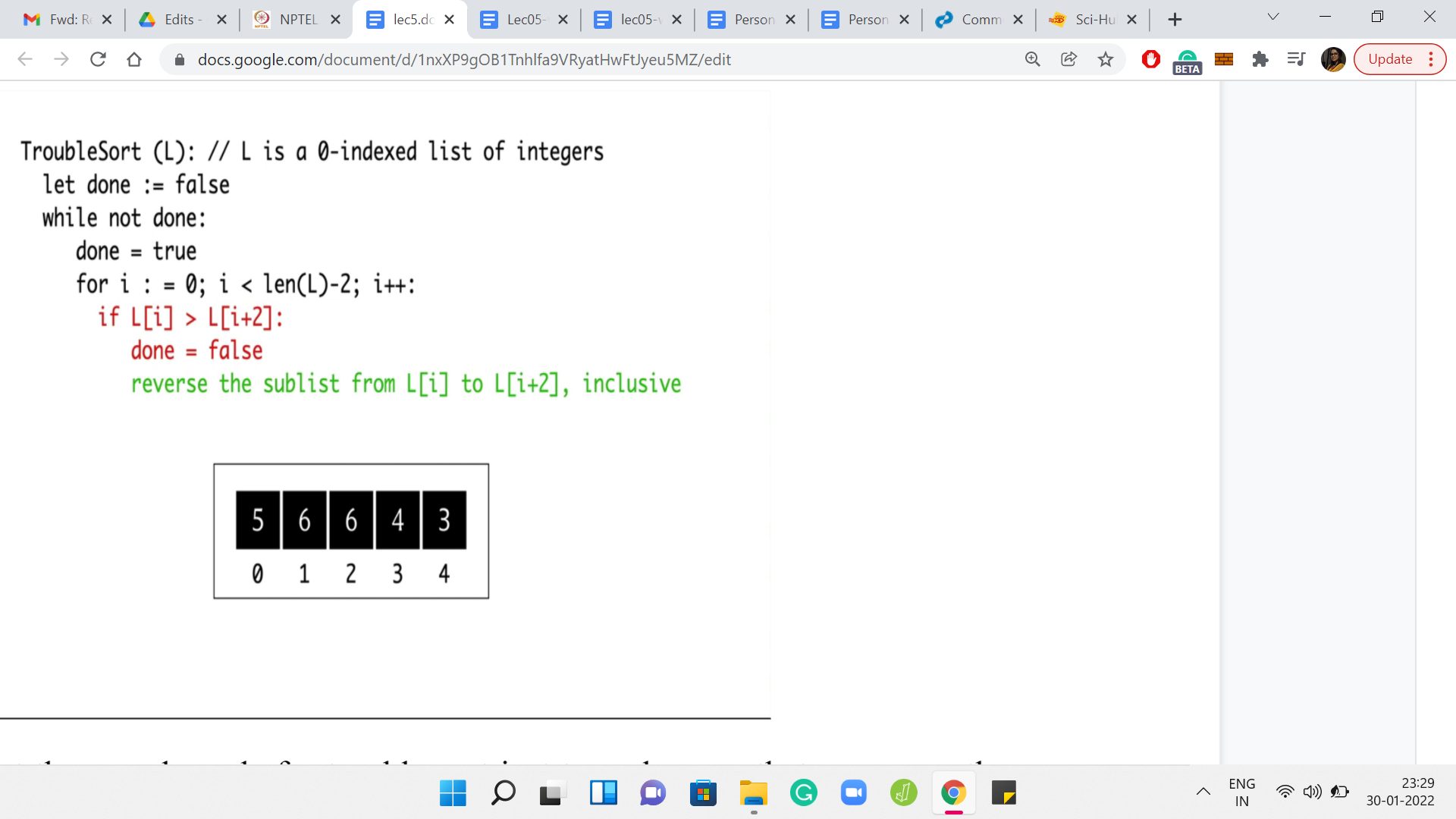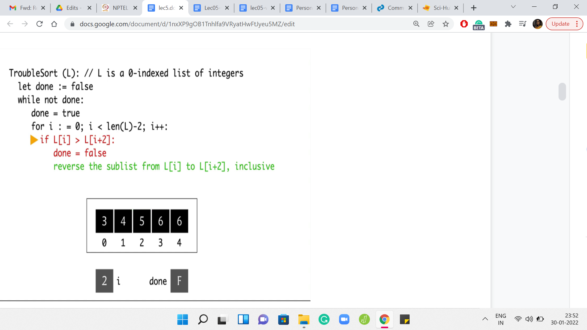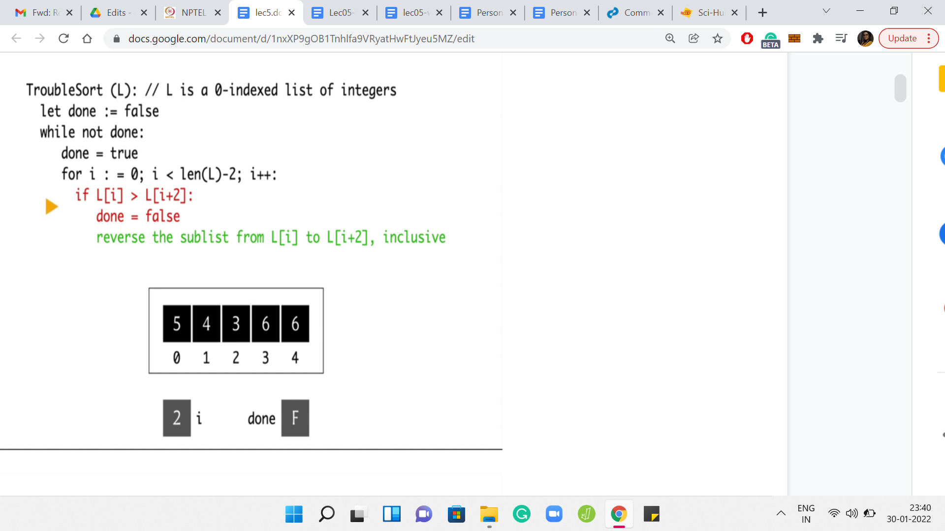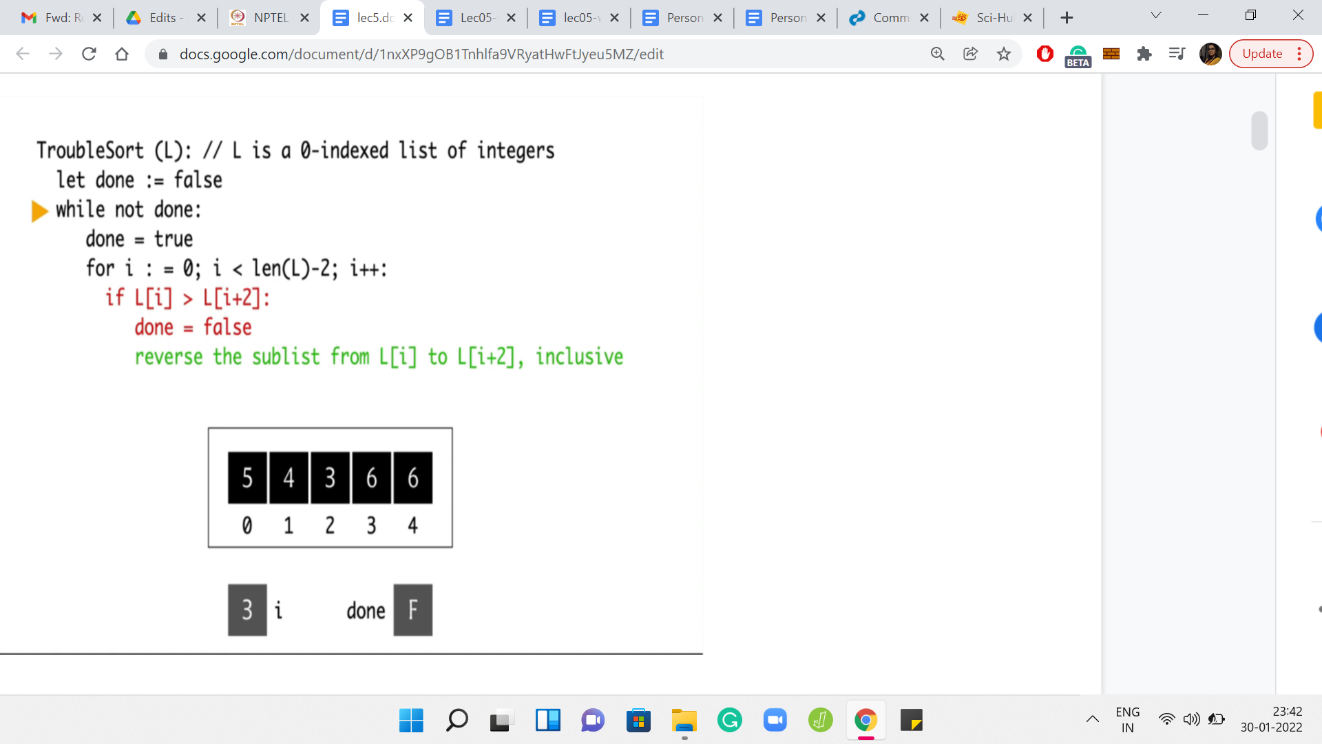 So, I am using n to denote Len of L. What happens in the ith iteration is that you compare the elements in L[i] and L[i+2]. These are the extreme points of the triplet that starts at the ith location. If it turns out that these elements are out of order, so the element that appears earlier is larger than the element that appears later, then we reset the done flag to false. We say: Okay, we did encounter a problem, this array was not sorted in its present form.