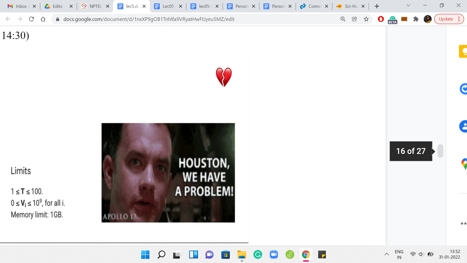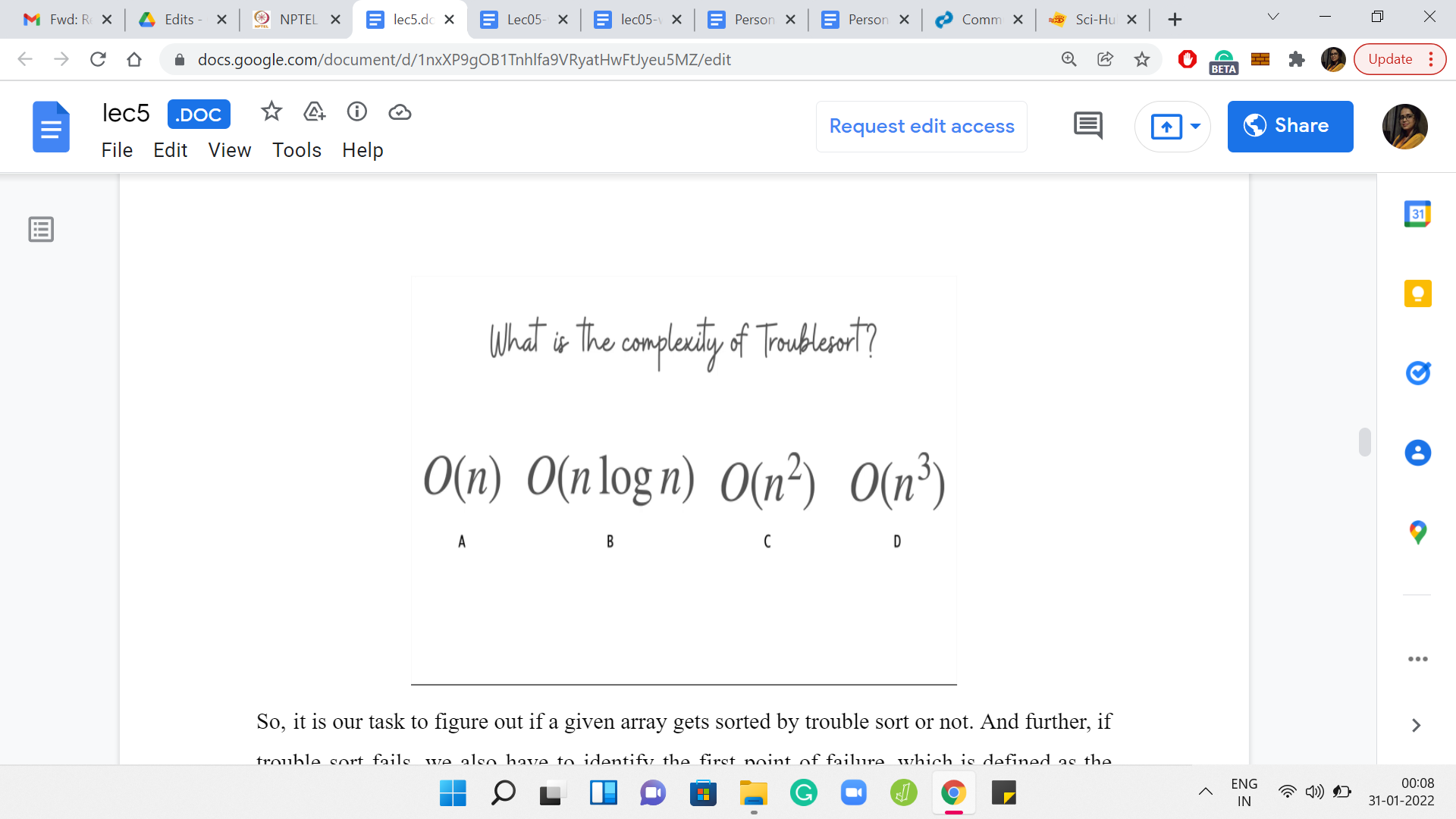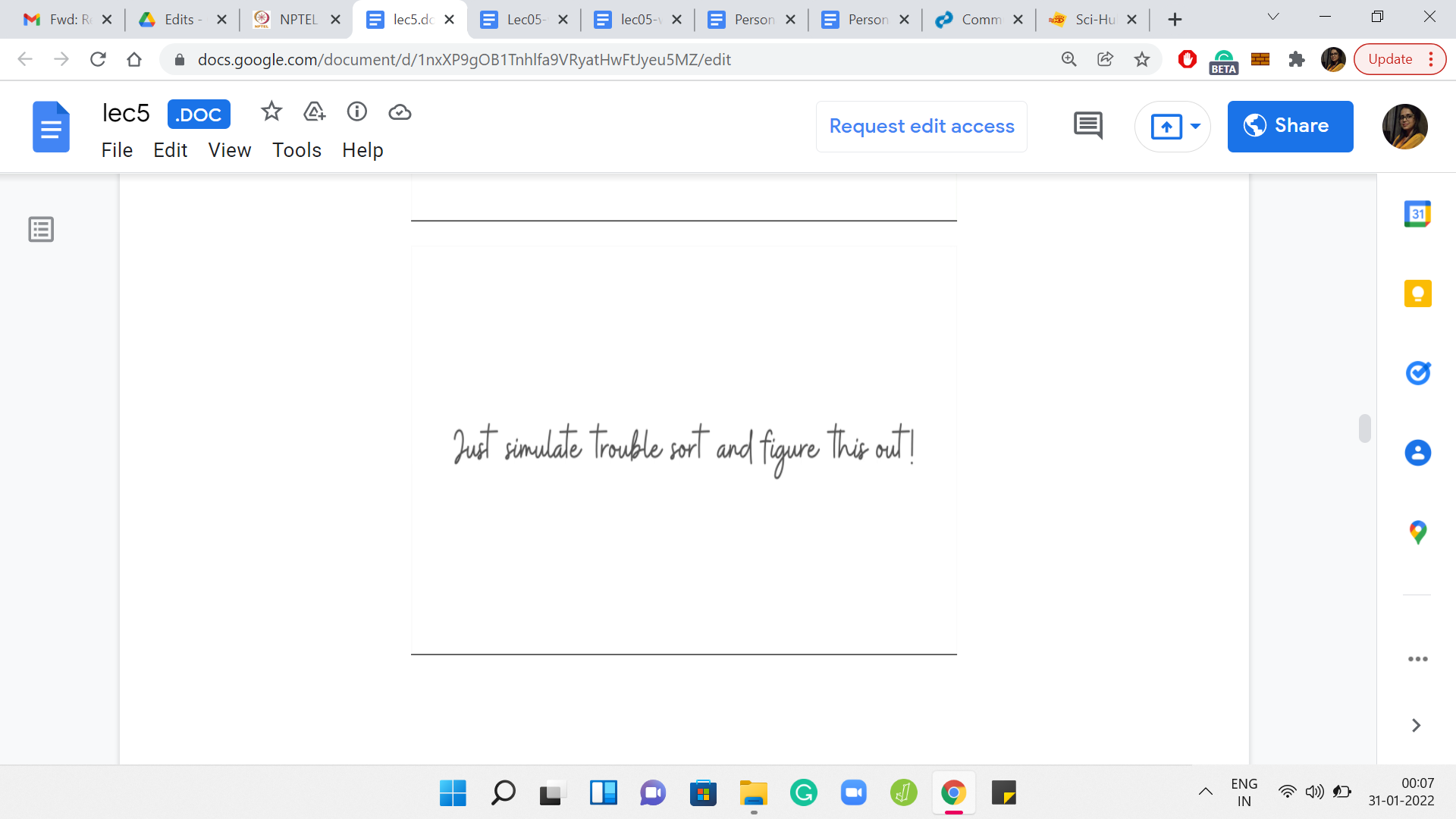 Why not just simulate trouble sort on the input array, and check if the resulting array is sorted or not? That is a perfectly valid approach. But to figure out if that is going to be feasible, we will have to think about the complexity of running trouble sort on a given array. Then we have to take a look at the problem limits. Let us address the first question first. Once again, take a pause here, go back in the lecture if you need to, to look at what trouble sort is doing more closely. Think about what would be a valid upper bound for the complexity of trouble sort, when it is run on an array with ‘n’ elements. Come back when you are ready. Hopefully, you have had a chance to think about this.