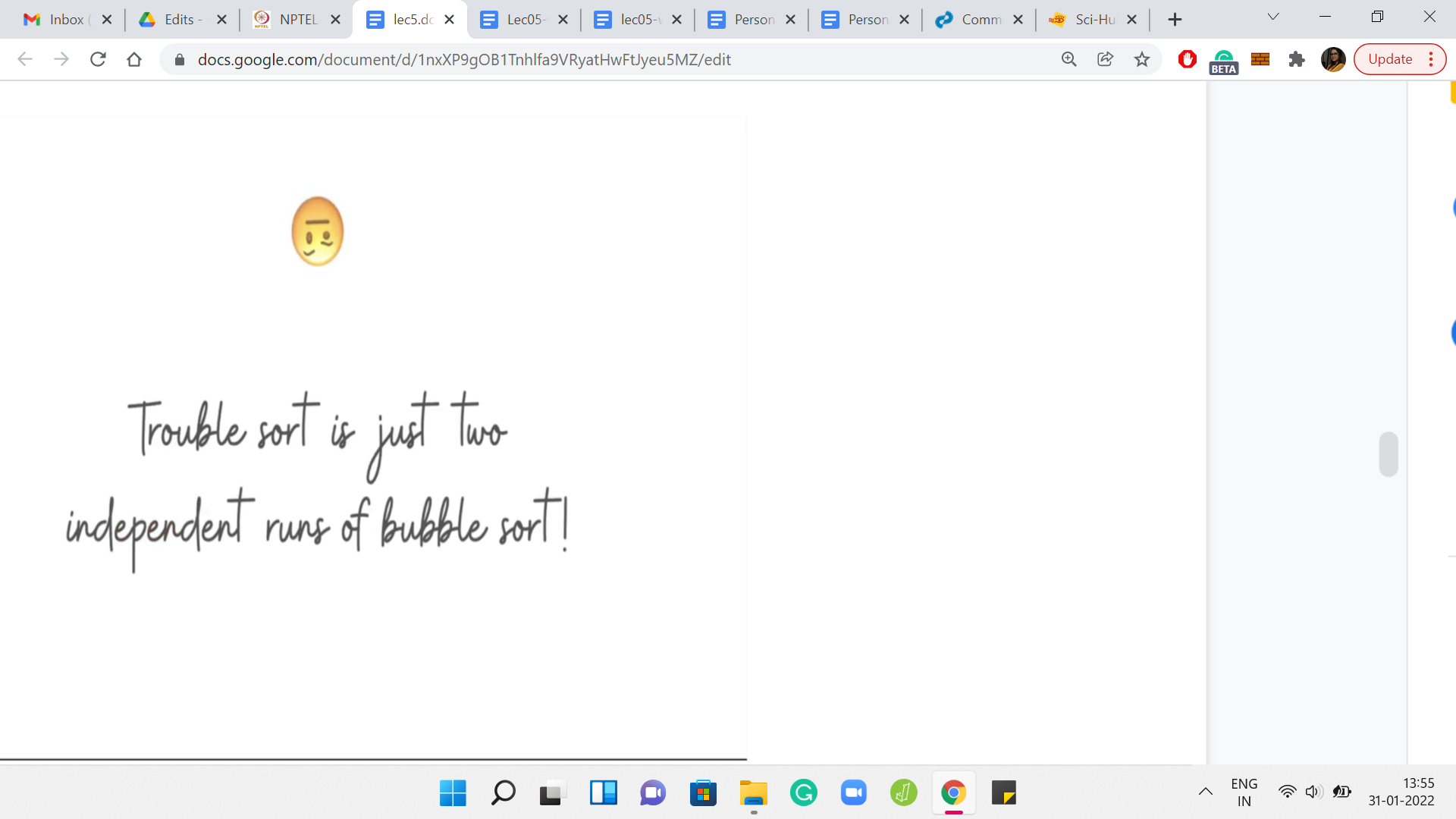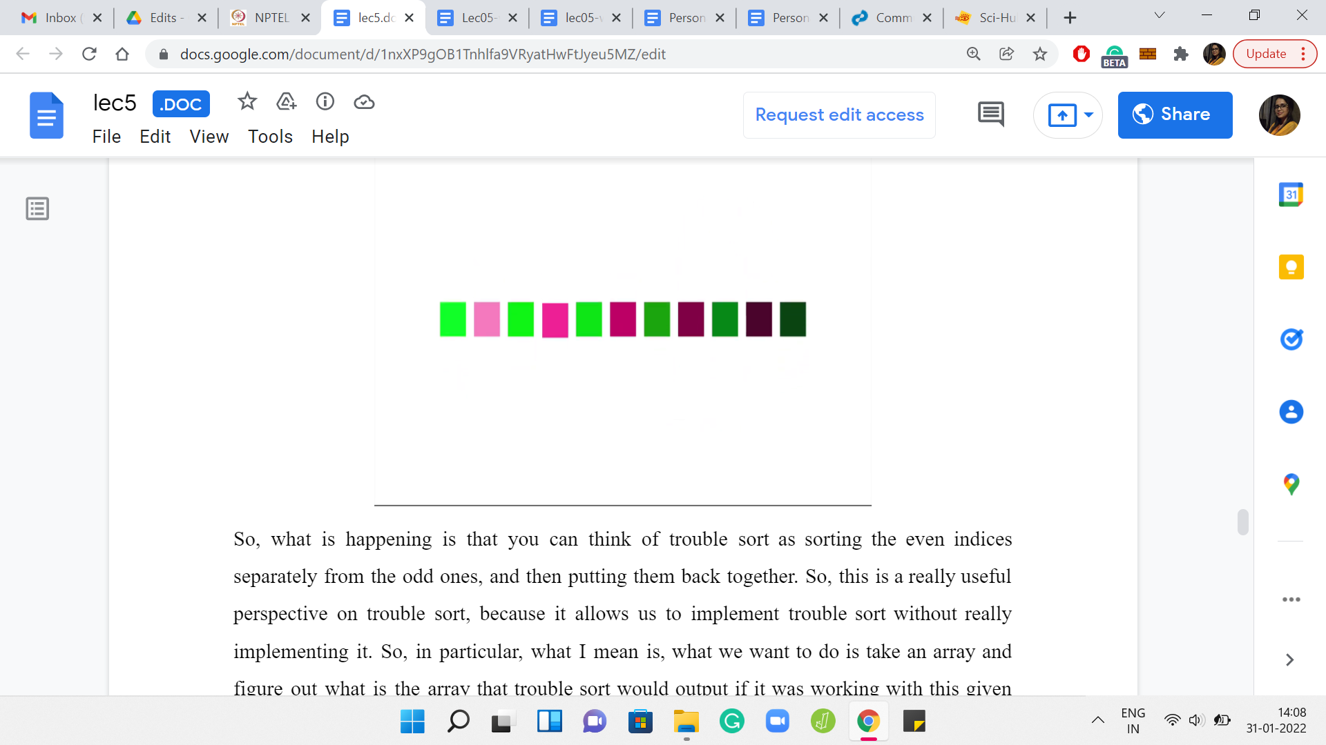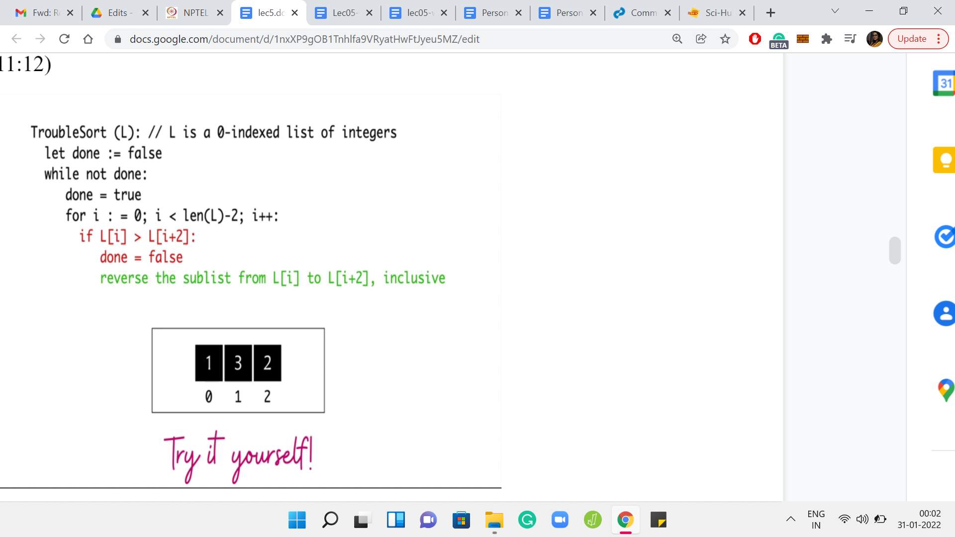 What I mean is that it is essentially running a familiar algorithm on some sub-array and it is running the same algorithm on another sub-array. Can you think of ‘trouble sort’ this way? If you have had a chance to think about this, you might have come to the conclusion that trouble sort is essentially just a bubble sort being run separately on the sub-array that consists of the odd indices, and separately on the sub-array that consists of the even indices.