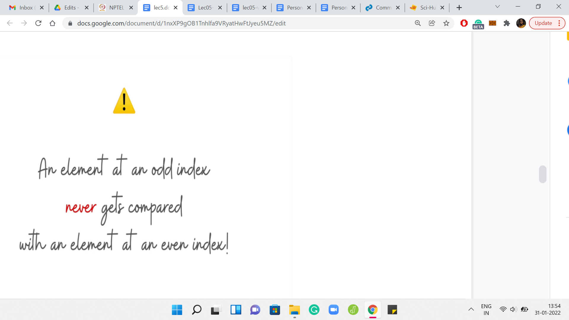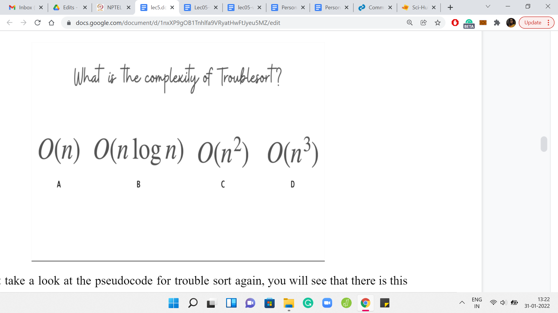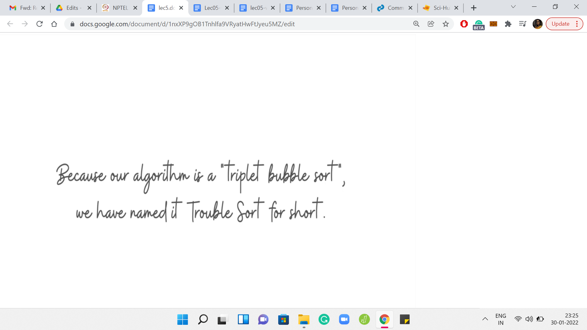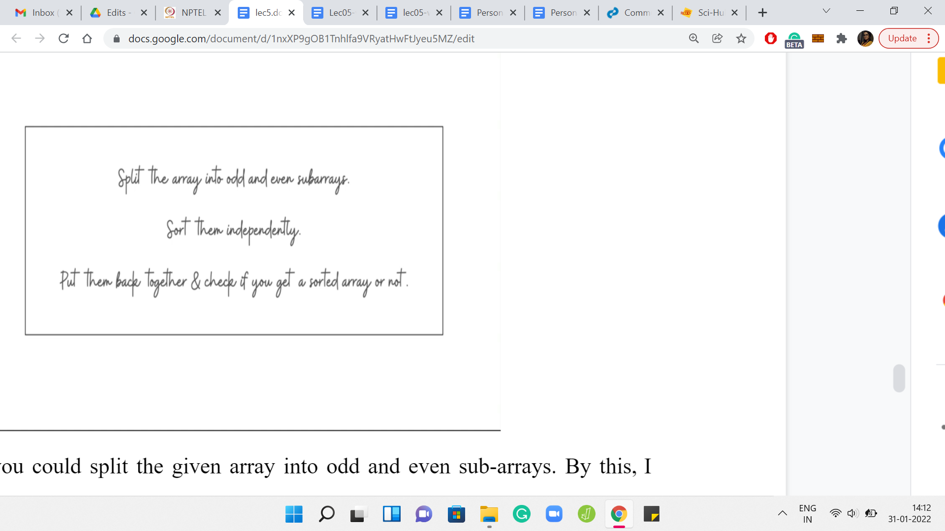 What I mean is that it is essentially running a familiar algorithm on some sub-array and it is running the same algorithm on another sub-array. Can you think of ‘trouble sort’ this way? If you have had a chance to think about this, you might have come to the conclusion that trouble sort is essentially just a bubble sort being run separately on the sub-array that consists of the odd indices, and separately on the sub-array that consists of the even indices.