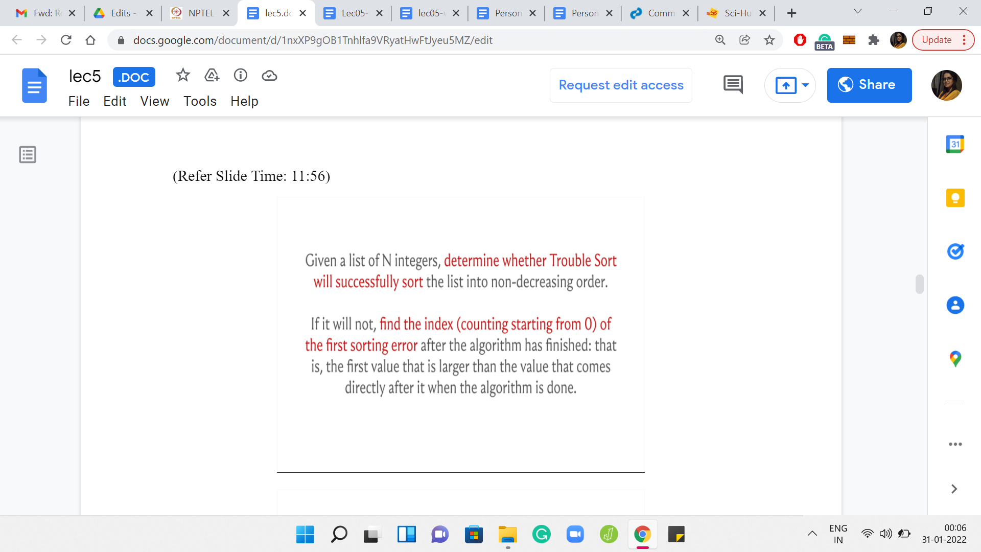 Make sure what parameters they take in, and whether they have any extra superpowers. Also, just double-check that you know how to do simple related tasks like, let us say, sorting an array in reverse order, sorting a subarray, and things like that. With all that said, we can now begin our discussion of the first problem for this week, which is Trouble Sort. It is, once again, a Google Code Jam qualification problem from back in 2018. It might remind you of Reversort because there are some reversals happening. But of course, it is quite a different problem. So, let us get started.
