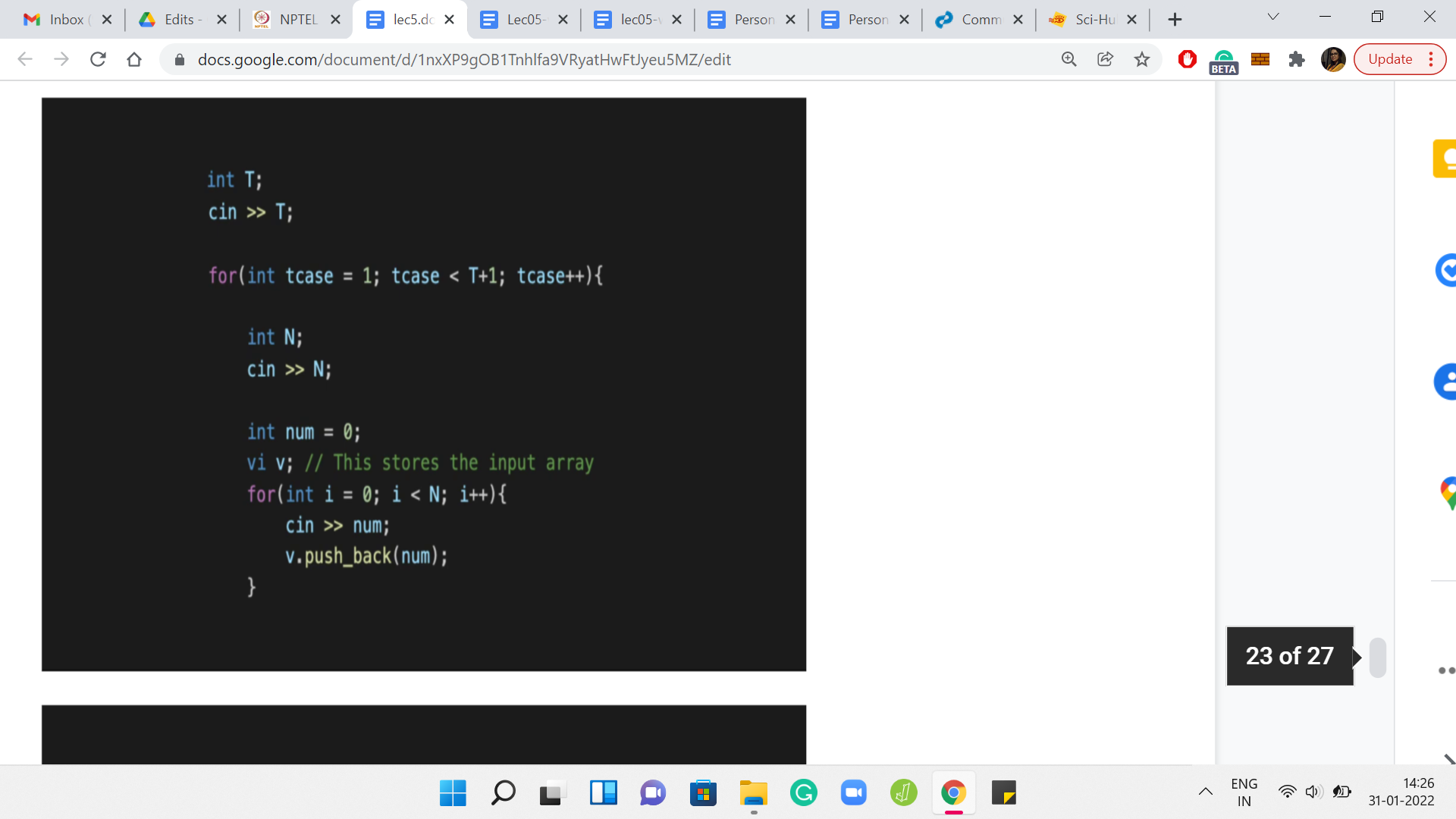 Let us take a look at the implementation. I am just going to share the code snippets from the sample solution. You can find the sample solution from the official GitHub repository for these lectures. There is a link in the description of this video, as well as the course website. So, there is nothing special about the input formatting. It is pretty standard stuff. There are ‘T’ test cases. Every test case is a number followed by the elements of the array given as space-separated integers, so you just read them all in.