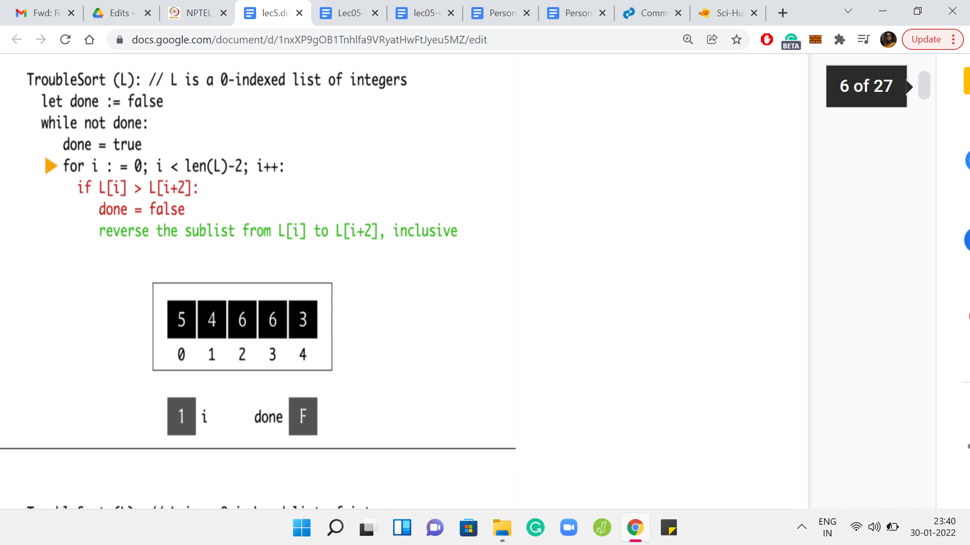 Once again, notice that 6 is greater than 3. The conditional will trigger. Done is already false. So, we do not have to do anything there. But we do have to execute the swap. At this point, the array looks like 5, 4, 3, 6, 6. Now, if we go back to the start of for loop, ‘i’ is incremented to 3. But notice that there is no triplet that starts from L[3]. In particular, we have just run out of room.