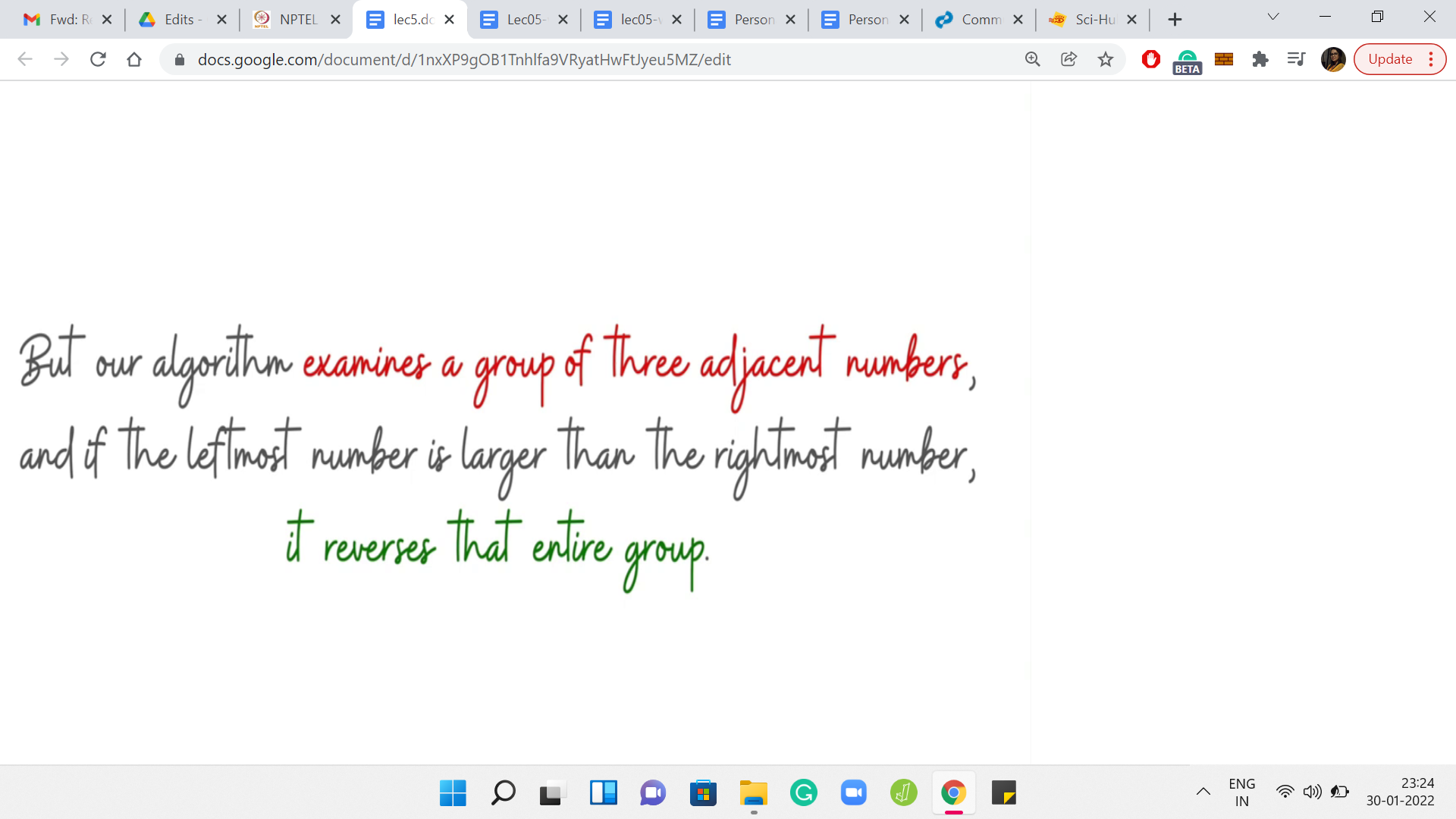 To fix this particular aberration, we will reverse the sub-list from L[i] to L[i+2]. Once again, notice that this amounts to swapping the elements at L[i] and L[i+2] because the middle element, which is at L[i+1] stays in place during this so-called reversal. That is pretty much the entire algorithm. You keep fixing triplets for as long as you need to.