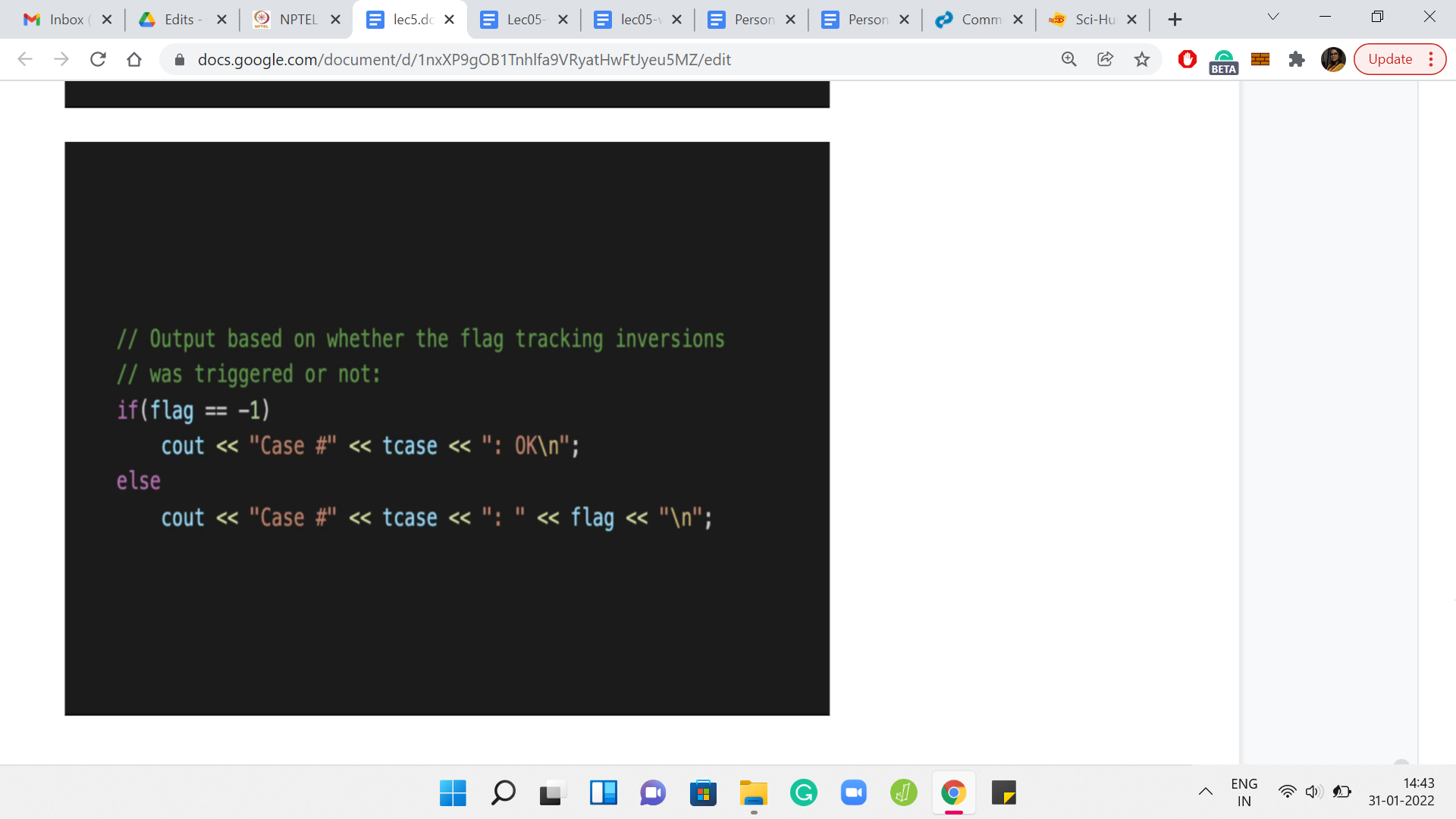 But if the flag is a value that is different from -1, then the value flag is actually the answer that you are looking for. It is the smallest index at which you encounter an adjacent inversion. You output the value of the flag in this case. The other details are pretty routine in terms of the formatting of the output and so forth.