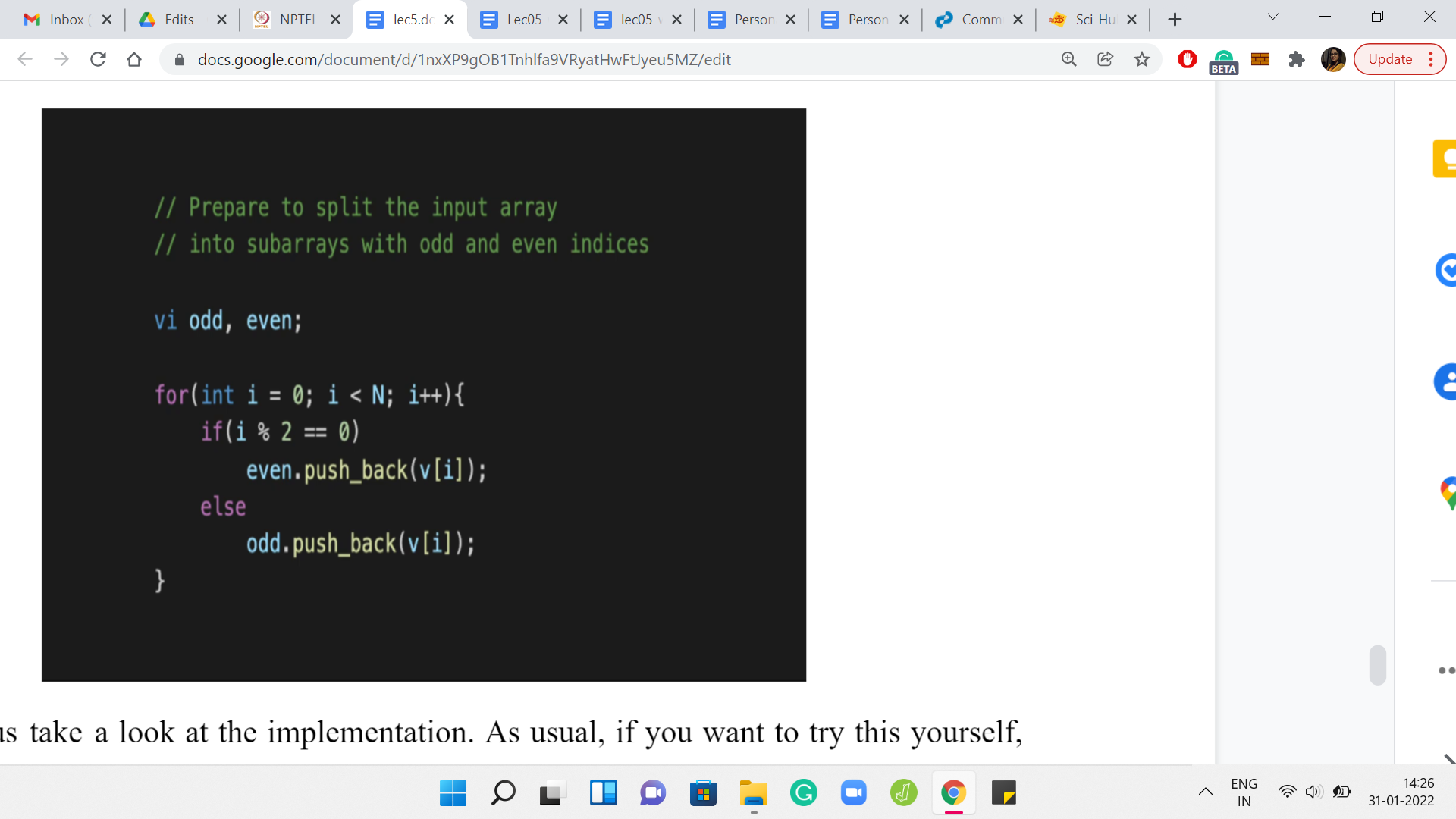 Essentially, it is the opposite of what we were doing previously. We were splitting the array and putting things back trying to ensure that the sorted version of the odd sub-array falls in place in the odd indices. The sorted version of the even array gets into the even indices of this array that we are calling ‘vsorted.’ Once again, you just run a loop. You do different things based on the parity of the current index.