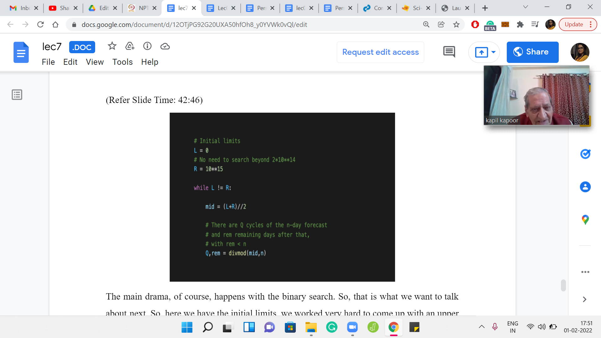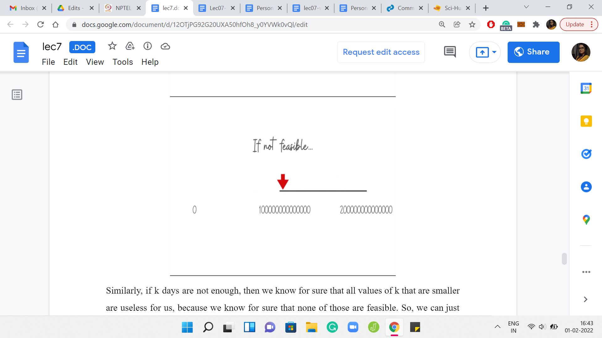 You try with the first midpoint: it says, well, these many days are not enough. You try with a larger value, and it is still not enough and you try with a larger value, and it is still not enough, and so on and so forth. You keep doing this till the very end. If every output is ‘this is not enough,’ then at that point, you know that you have exited the binary search with some sort of a failure to discover a ‘k’ in the range that we had stipulated, which would work for you.