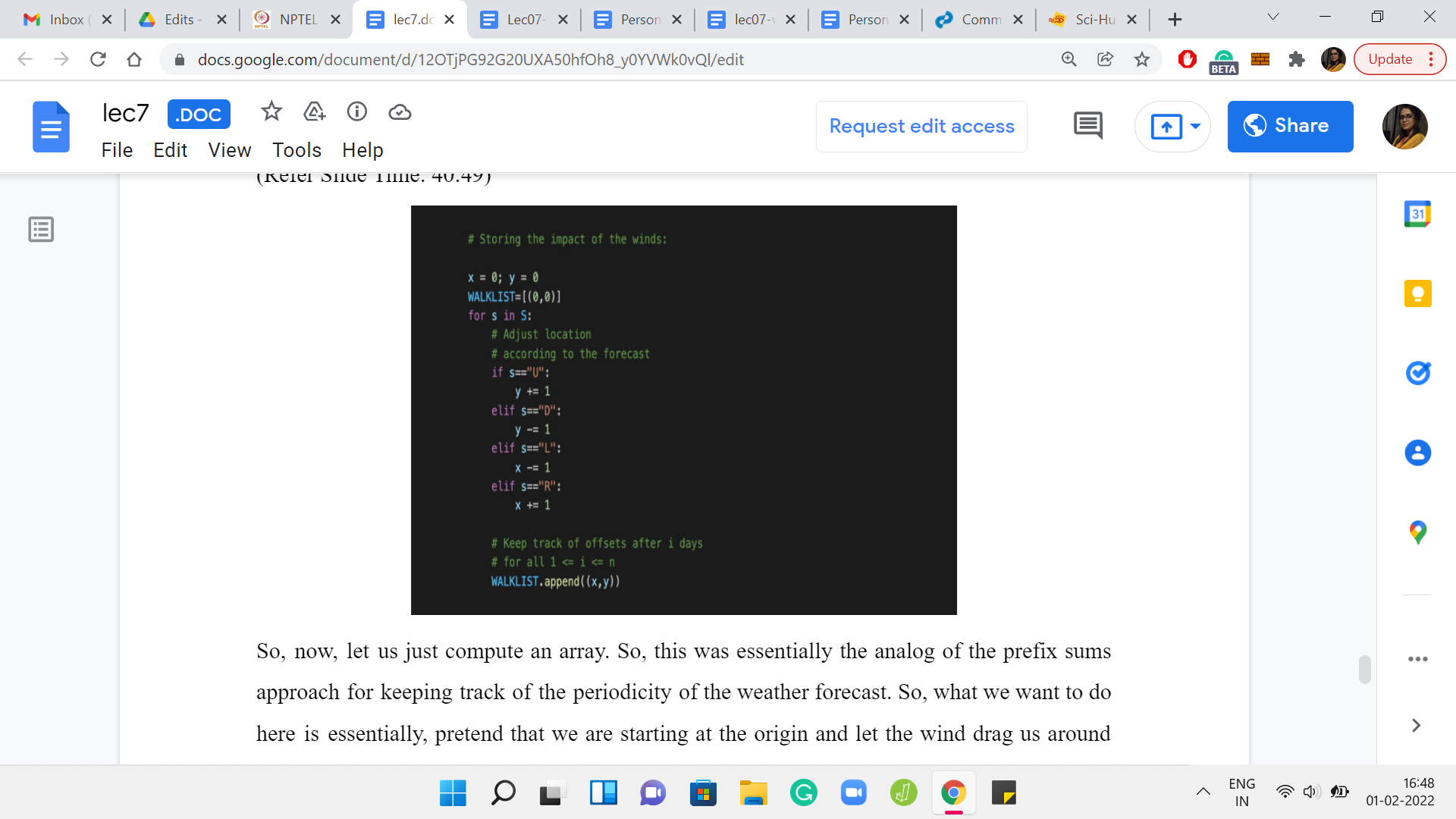 Now, let us just compute an array. This was essentially the analog of the prefix sums approach for keeping track of the periodicity of the weather forecast. What we want to do here is, essentially, pretend that we are starting at the origin and let the wind drag us around wherever it needs to, based on the weather forecast. This code here is exactly like the code version of the slide where we were explaining what the forecast means, what the different letters mean.