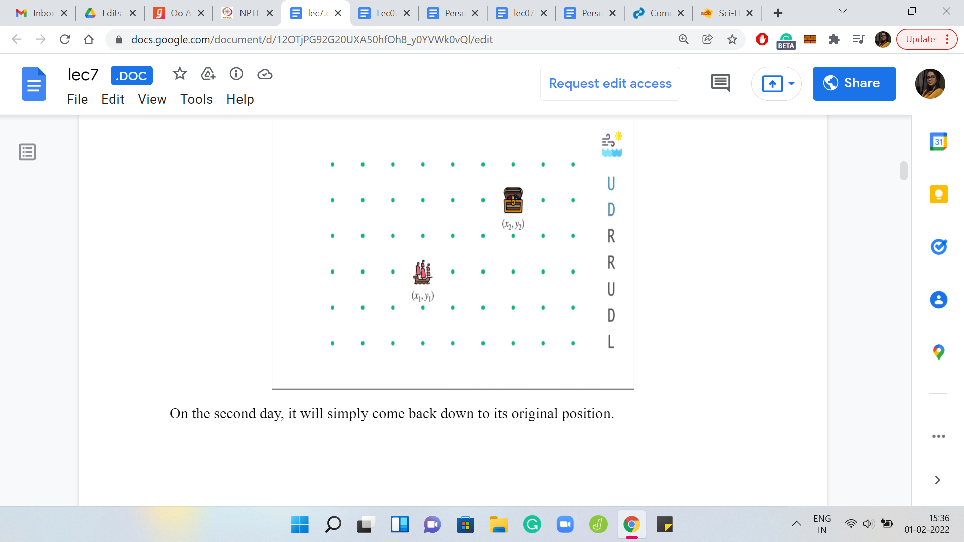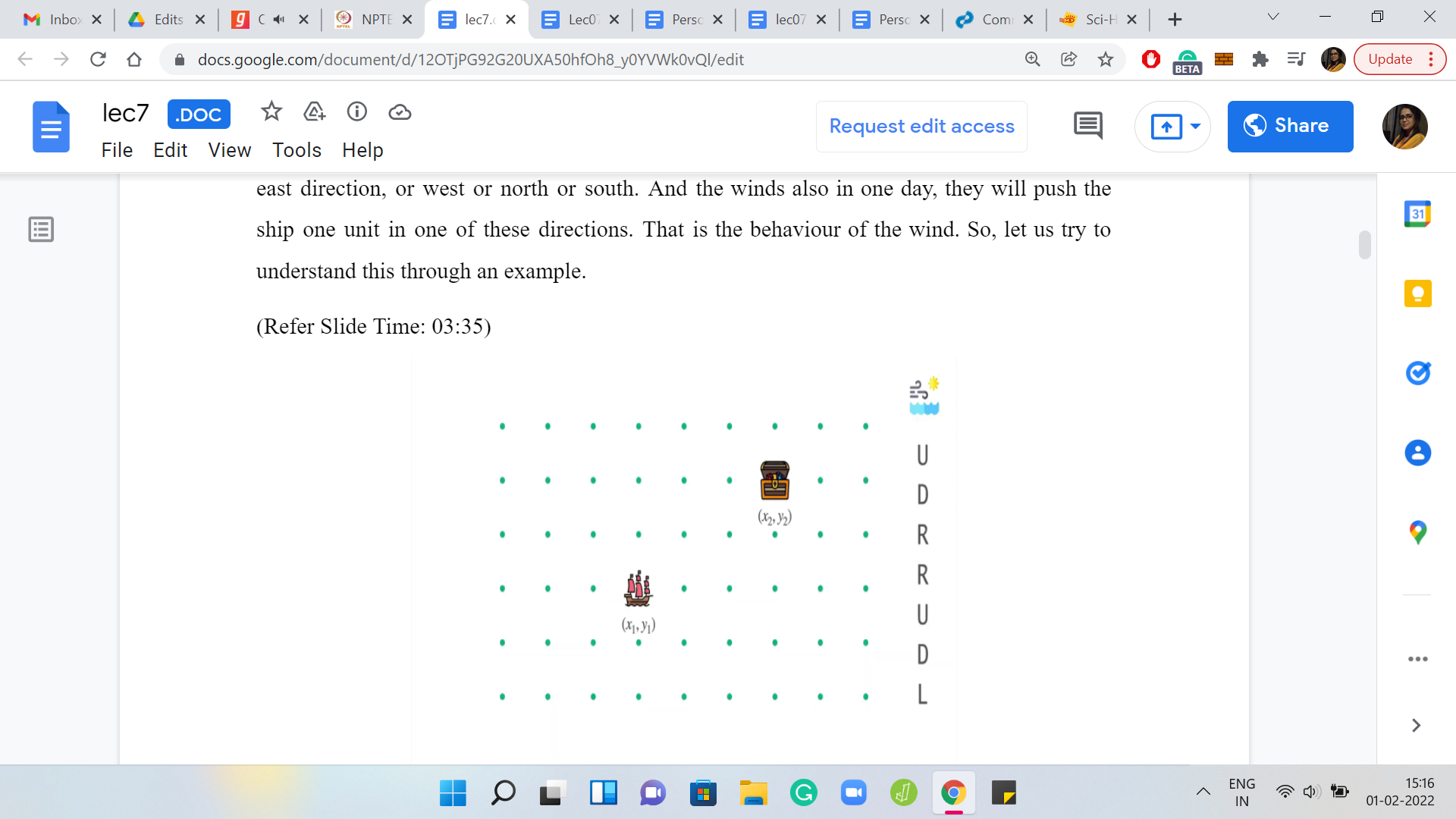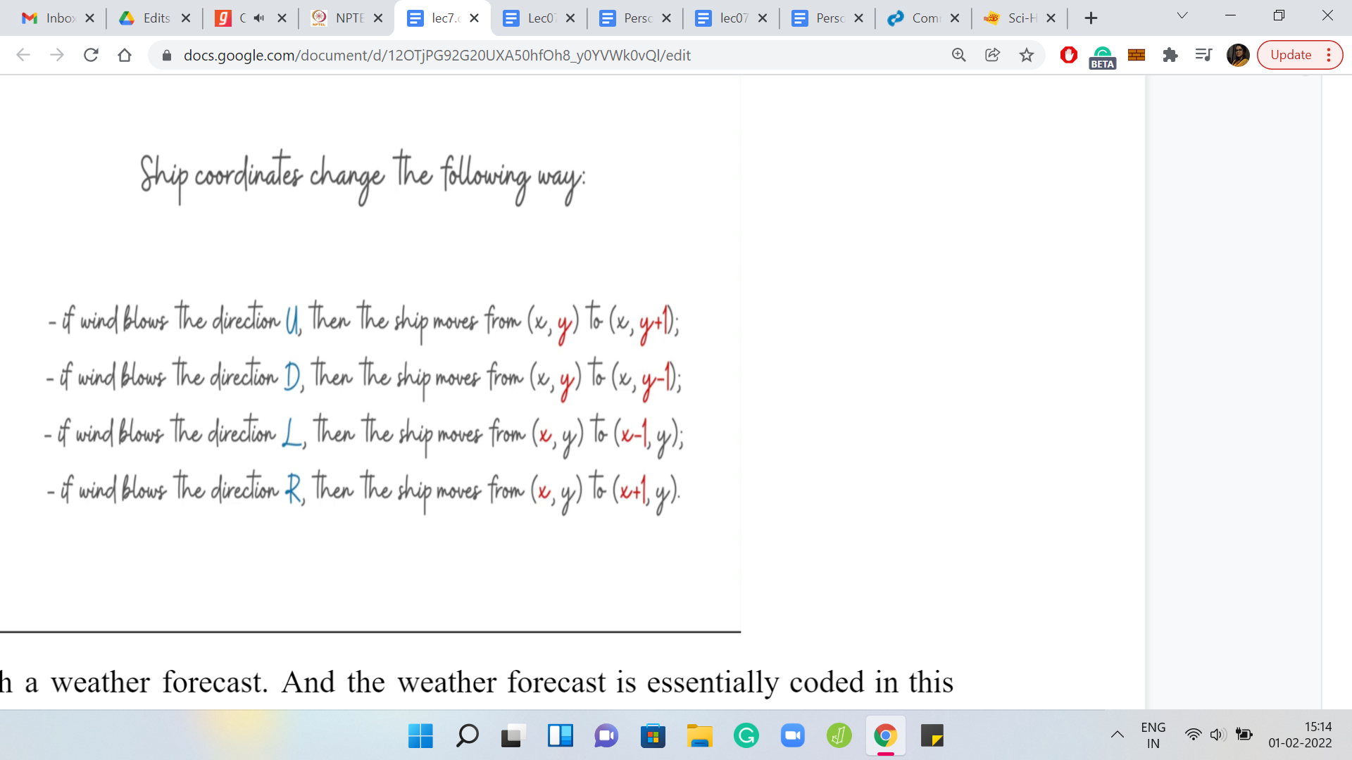 This is through a weather forecast. And the weather forecast is essentially coded in this language. It is a string, which has ‘n’ letters and each of these letters is one of these alphabets here. It is either ‘U, D, L, or R,’ signifying whether the wind is going to blow the ship in the east direction, or west or north or south. The winds also, in one day, will push the ship one unit in one of these directions. That is the behavior of the wind. Let us try to understand this through an example.
