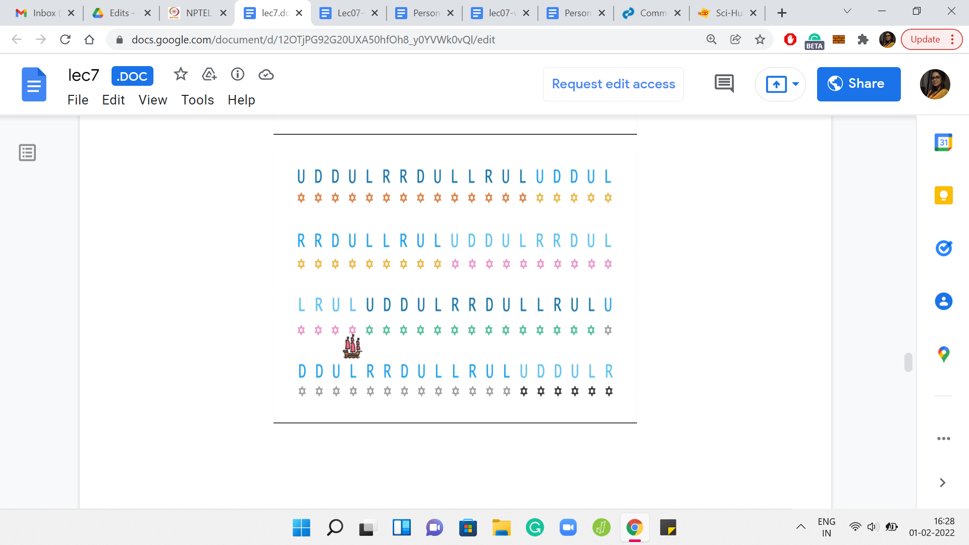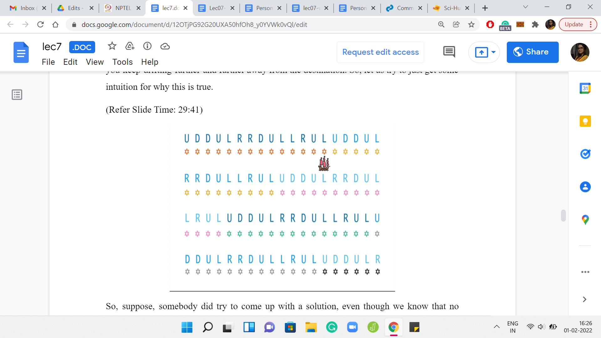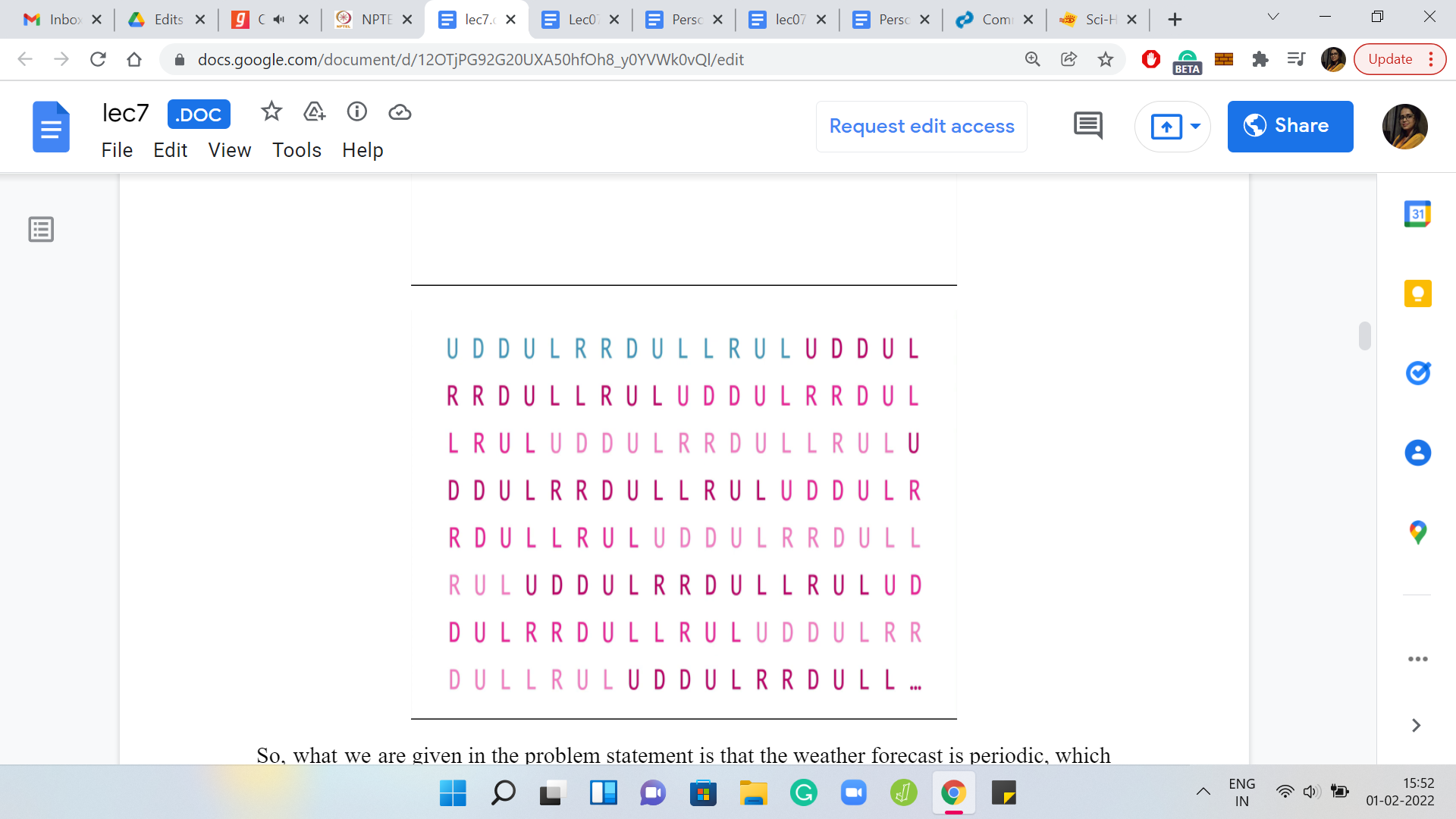 This is through a weather forecast. And the weather forecast is essentially coded in this language. It is a string, which has ‘n’ letters and each of these letters is one of these alphabets here. It is either ‘U, D, L, or R,’ signifying whether the wind is going to blow the ship in the east direction, or west or north or south. The winds also, in one day, will push the ship one unit in one of these directions. That is the behavior of the wind. Let us try to understand this through an example.