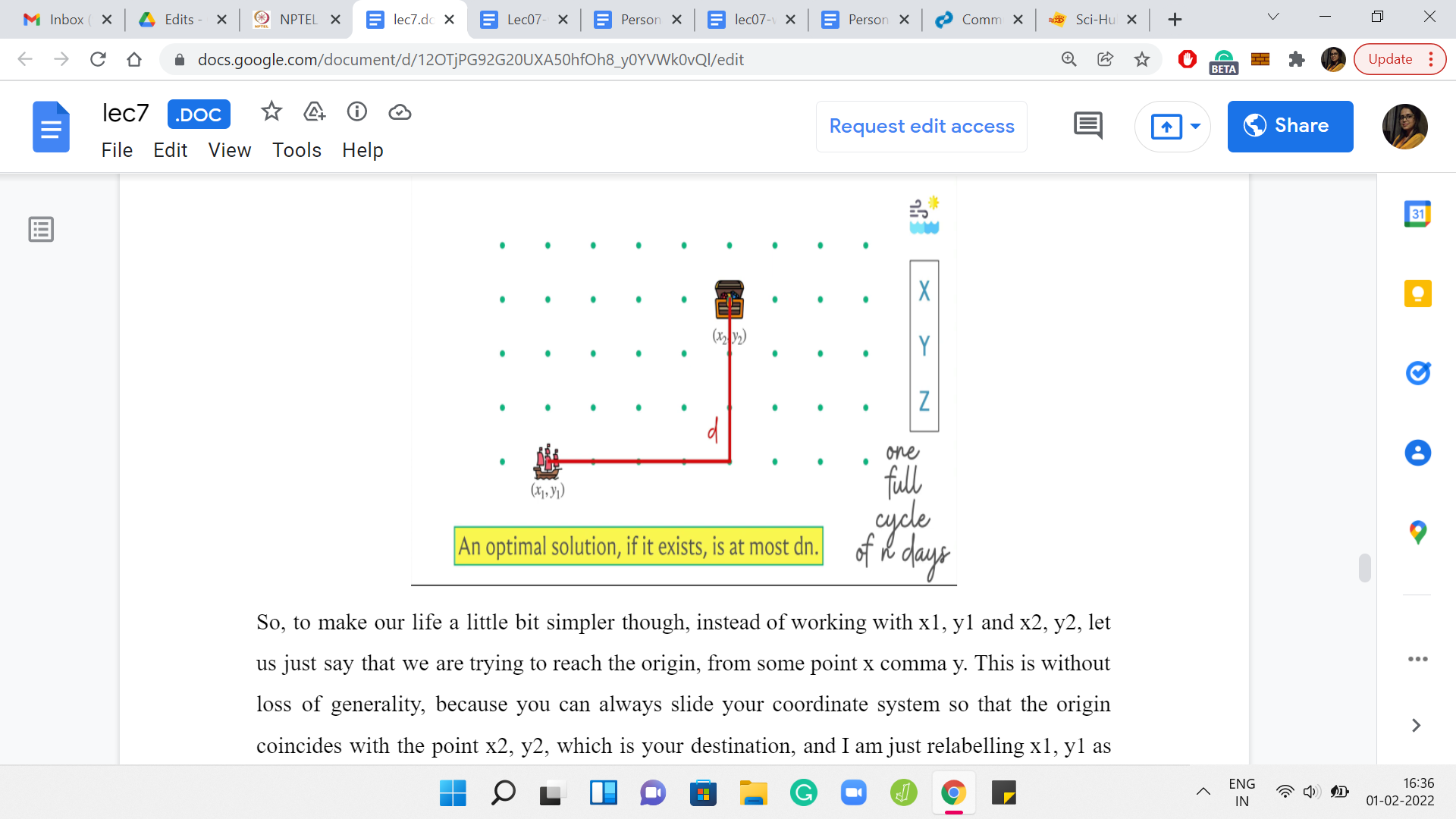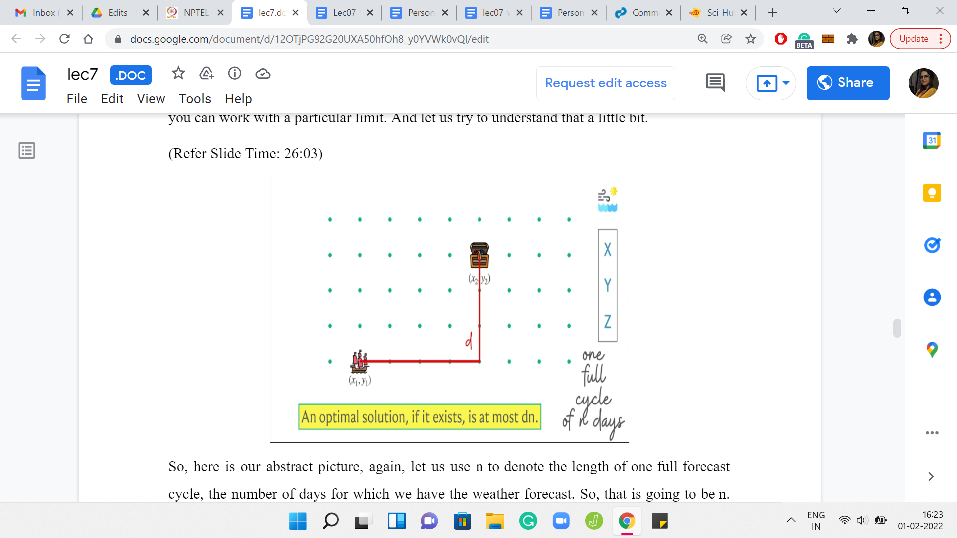 Here is our abstract picture. Let us use ‘n’ to denote the length of one full forecast cycle, the number of days for which we have the weather forecast. Let us also use ‘d’ to denote the Manhattan distance between the original source and destination points. That is what we have. The claim is going to be that if this is not one of those impossible scenarios, then there is a solution whose cost in terms of the number of days is at most d*n, and d and n are as we just defined.