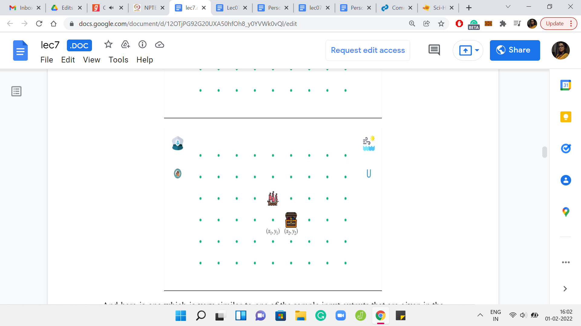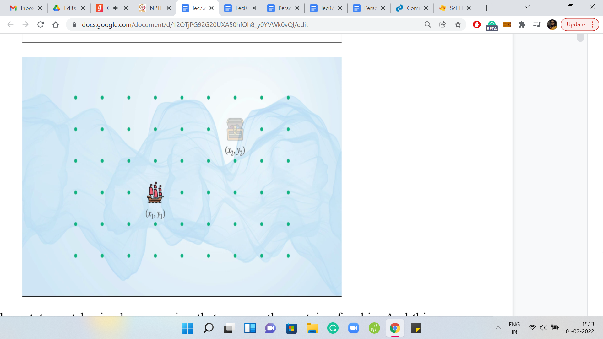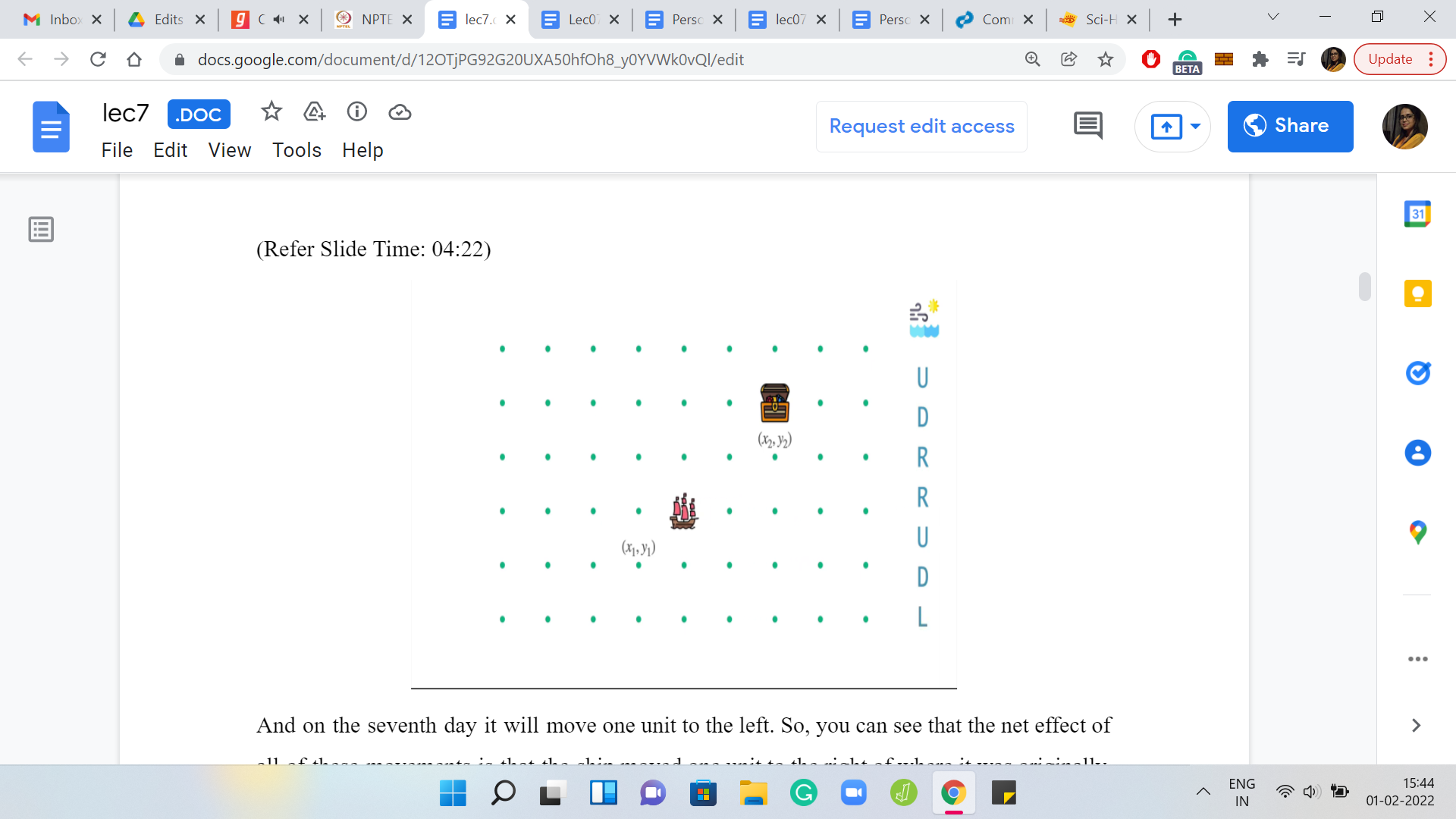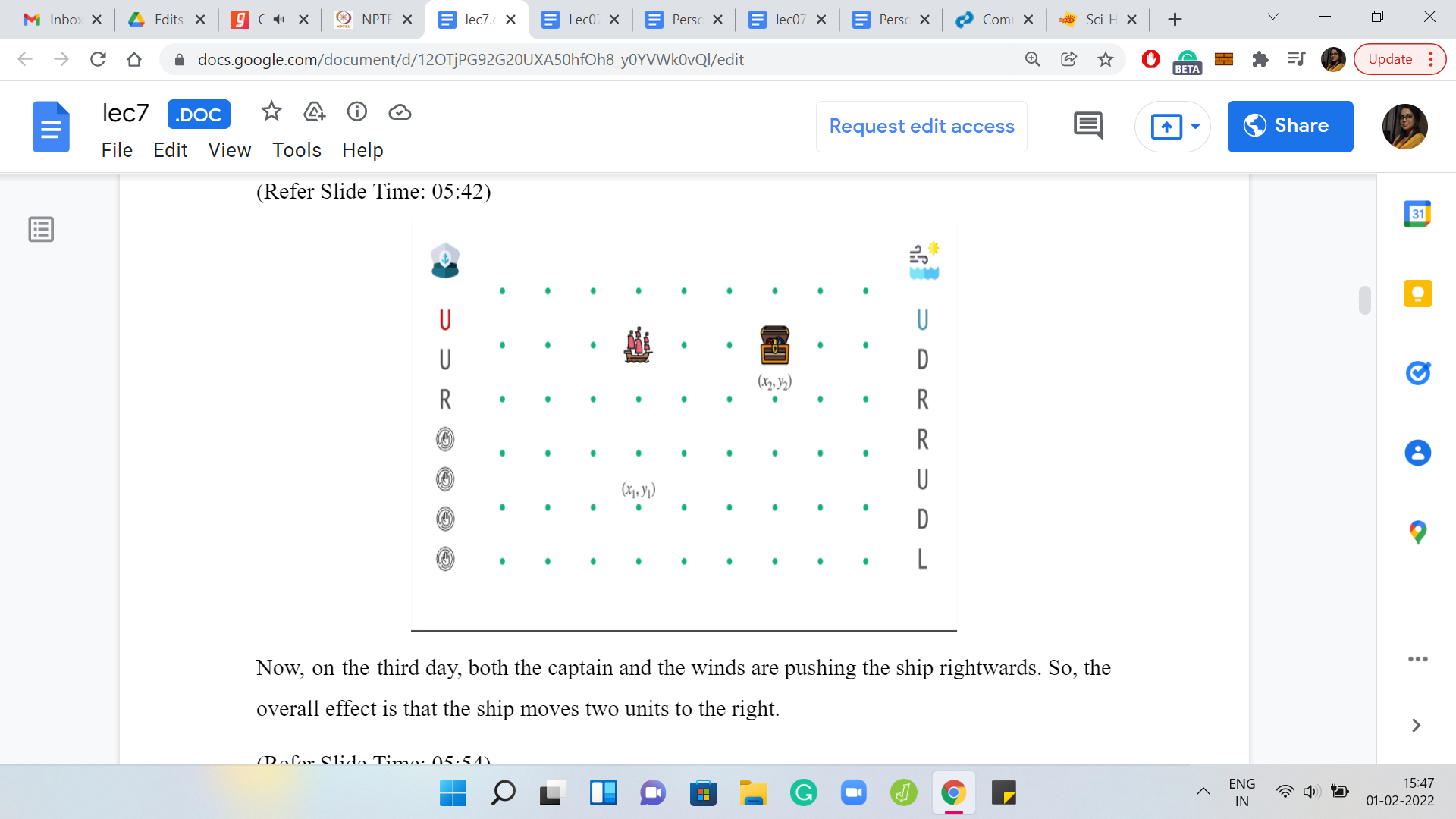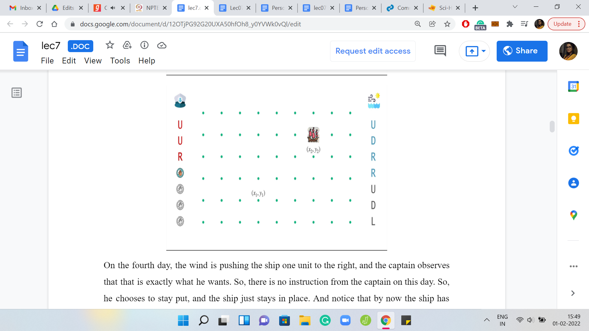 We have here the initial state of the ship. We also have the weather forecast for the next 7 days. I was talking about one step so far. But in the language of the problem statement, these steps are codified as days. So, I will talk about days and steps interchangeably. With this one-week weather forecast, let us see what the ship will do if it has no other forces acting on it. Right now the captain is sleeping peacefully and is not steering the ship in any way. So, the winds alone will have the following effect on the ship.