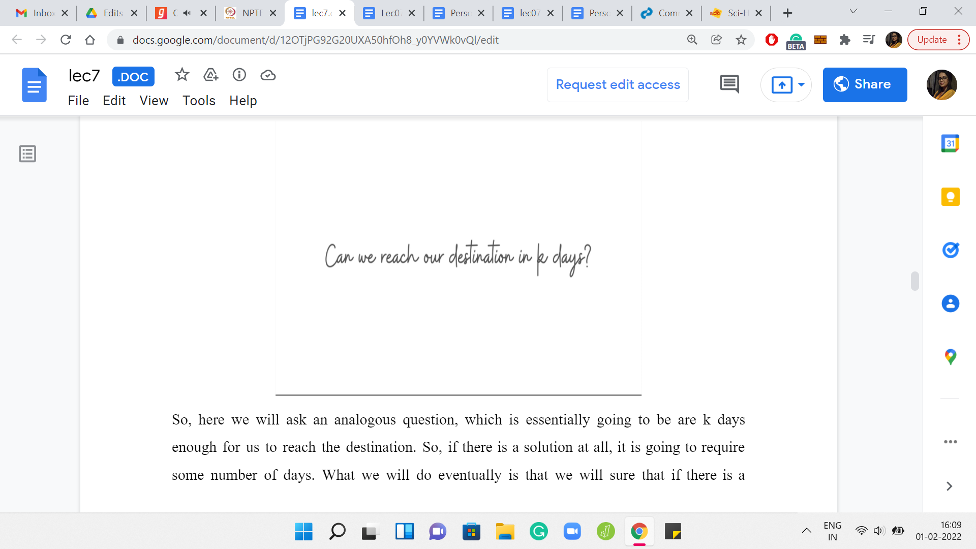 Based on whether the answer to that question is yes or no, we will prune our search space appropriately. These are the two things that we need to figure out. Let us address the second question first. Let us talk about how to figure out if we can reach our destination in ‘k’ days.