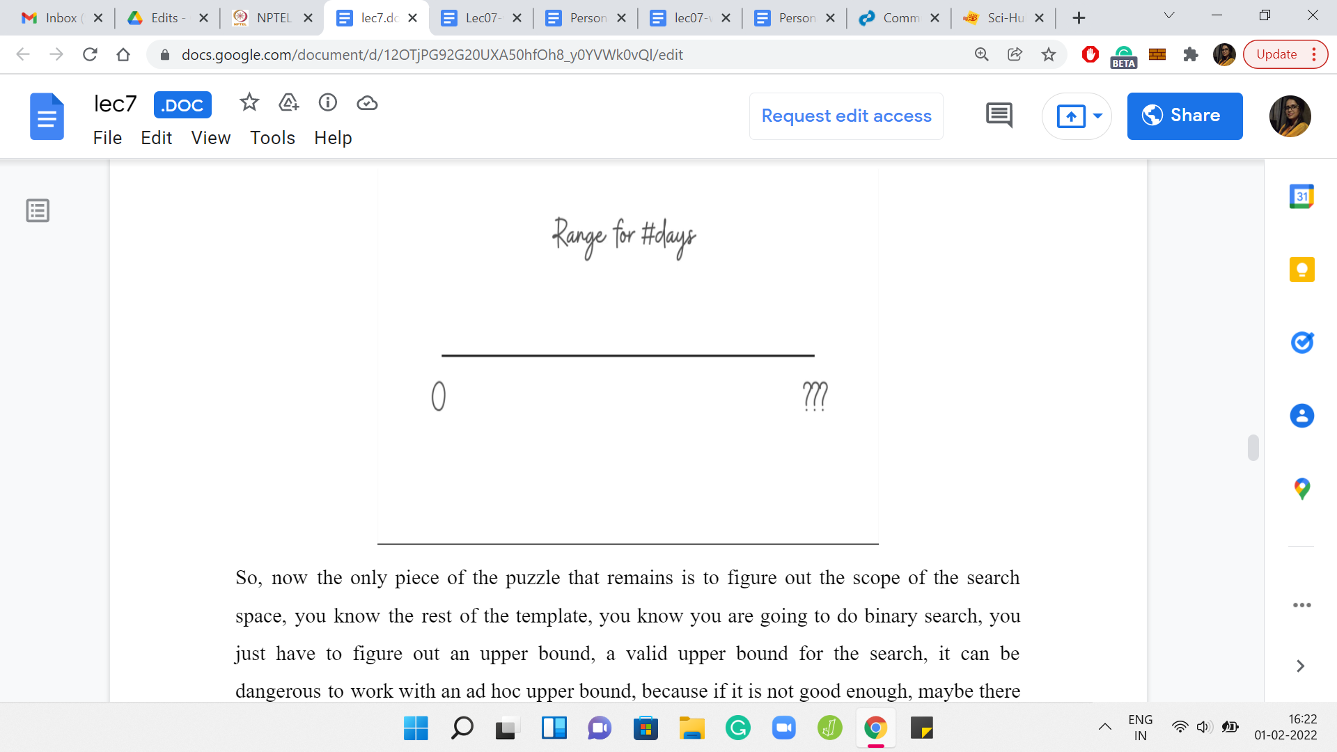 If you have some intuition based on the limits of the problem, you could just try to give it a shot with that. Or you could simply try and shoot for the largest upper bound that the time constraints will allow. At this point of solving the problem, we are probably reasonably confident that our overall binary search template is correct. We also know how to handle the probing questions of whether ‘k’ days are enough.