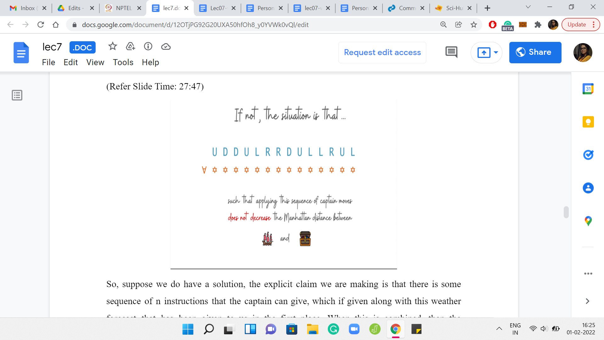 Suppose we do have a solution. The explicit claim we are making is that there is some sequence of ‘n’ instructions that the captain can give, which, if given along with this weather forecast that has been given to us in the first place, when is combined, then the Manhattan distance between the source and destination strictly decreases. That is the claim. So, again, just to recap, because this was quite a handful. What we are saying is that if there was a solution, that means there is a way of getting closer to the destination in one cycle of ‘n’ days.
