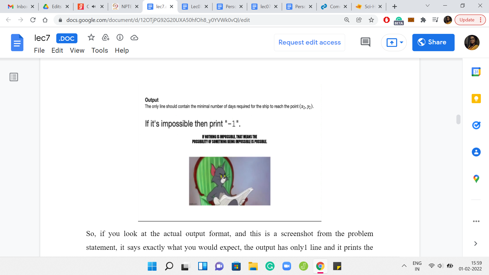 If you look at the actual output format, and this is a screenshot from the problem statement, it says exactly what you would expect. The output has only one line and it prints the minimum number of days that are required for the ship to reach x2, y2. But then it has this interesting follow-up line which says ‘if it is impossible, then print -1.’ This line right here suggests the possibility that our task may, in fact, be impossible in some situations.