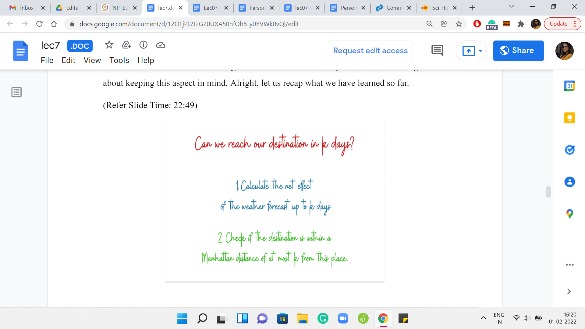 So, ‘k’ days are enough if and only if the Manhattan distance between x3, y3, and x2, y2 is at most ‘k,’ where x3, y3 is the point that you land up at if you were to start at x1, y1, and just obediently follow the weather forecast for ‘k’ days. Once again, we will have to figure out how to write this in code. Because ‘k’ could very well be more than ‘n,’ which is the number of days for which you have the weather forecast.