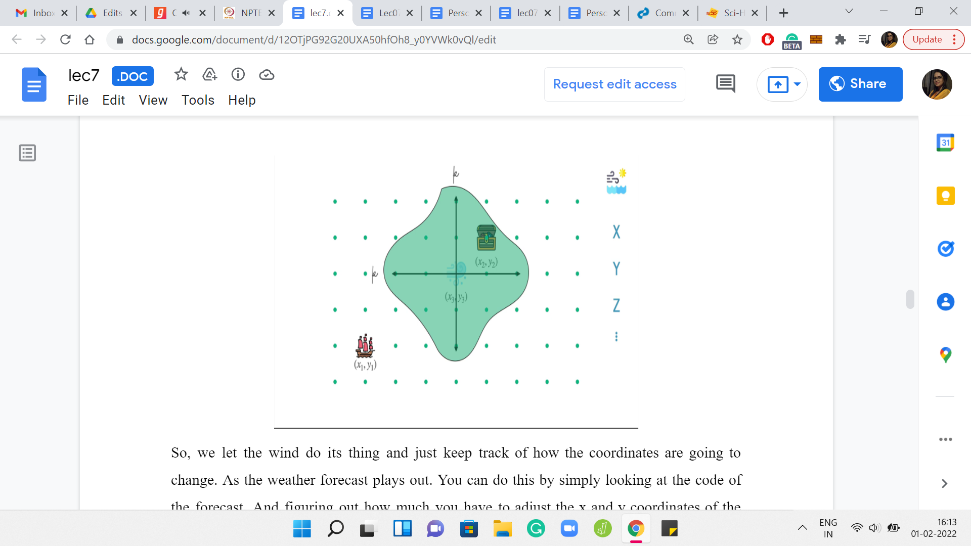 Note that the thing we need to make precise is the following. We want some kind of clean criteria that will help us identify exactly which points are accessible, given that we start at the starting point and the wind brings us to x3, y3, if considered stand-alone. Also, given the fact that we still have the opportunity of ‘k’ days worth of course correction across both coordinates combined.