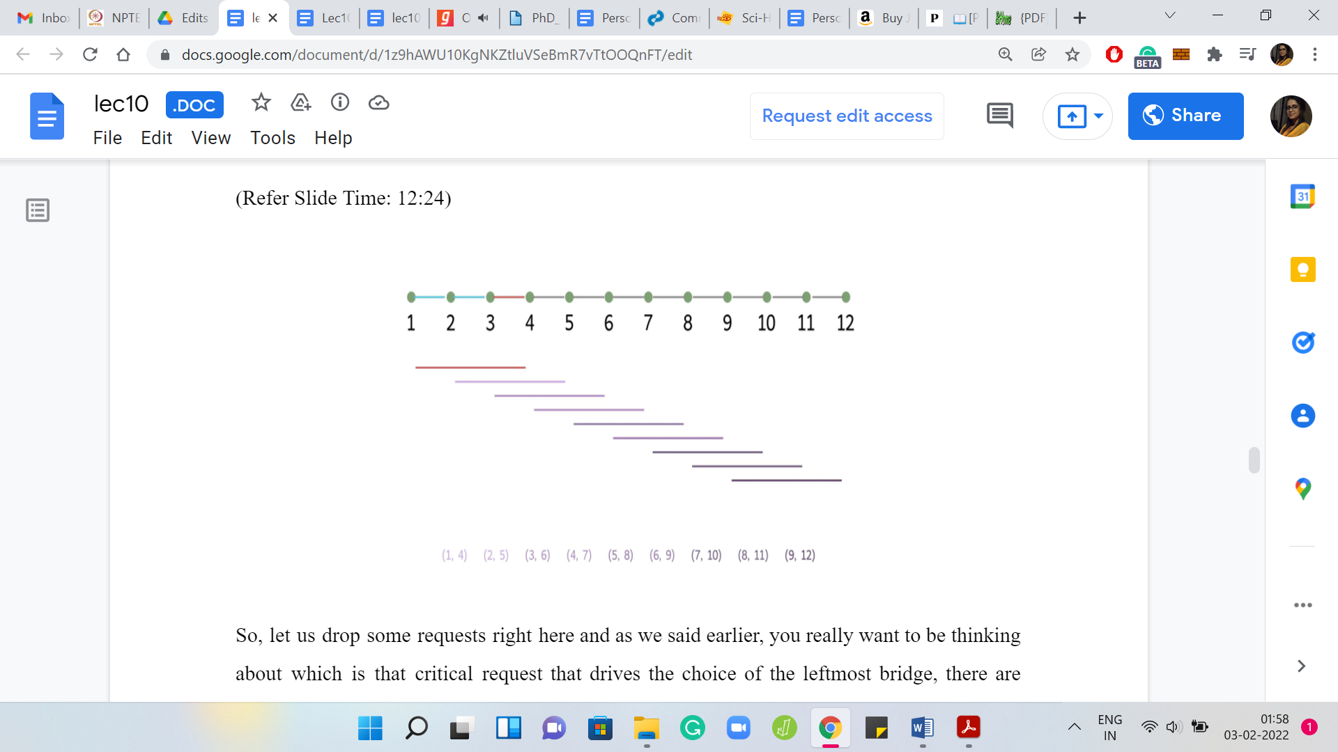 Let us drop some requests right here and, as we said earlier, you really want to be thinking about: Which is that critical request that drives the choice of the leftmost bridge? There are some natural candidates. Is that the one that finishes first? Is it the one that starts first? Is it the one that finishes last? The one that starts the last? If you think about it, you will realize that it is probably the request that finishes first.