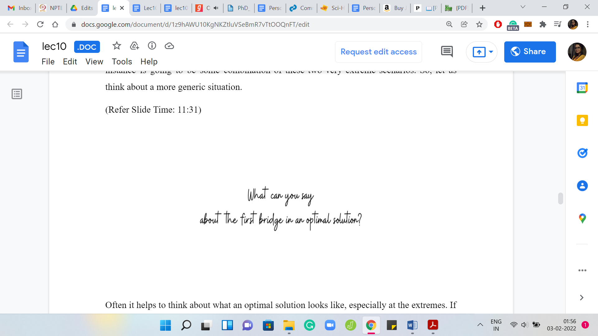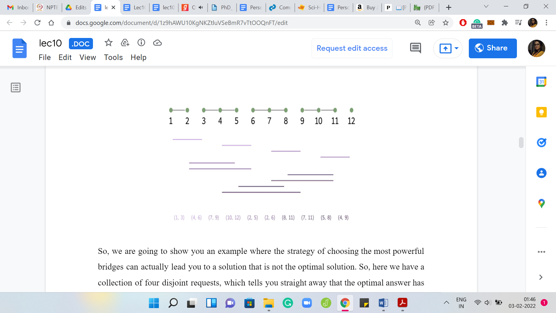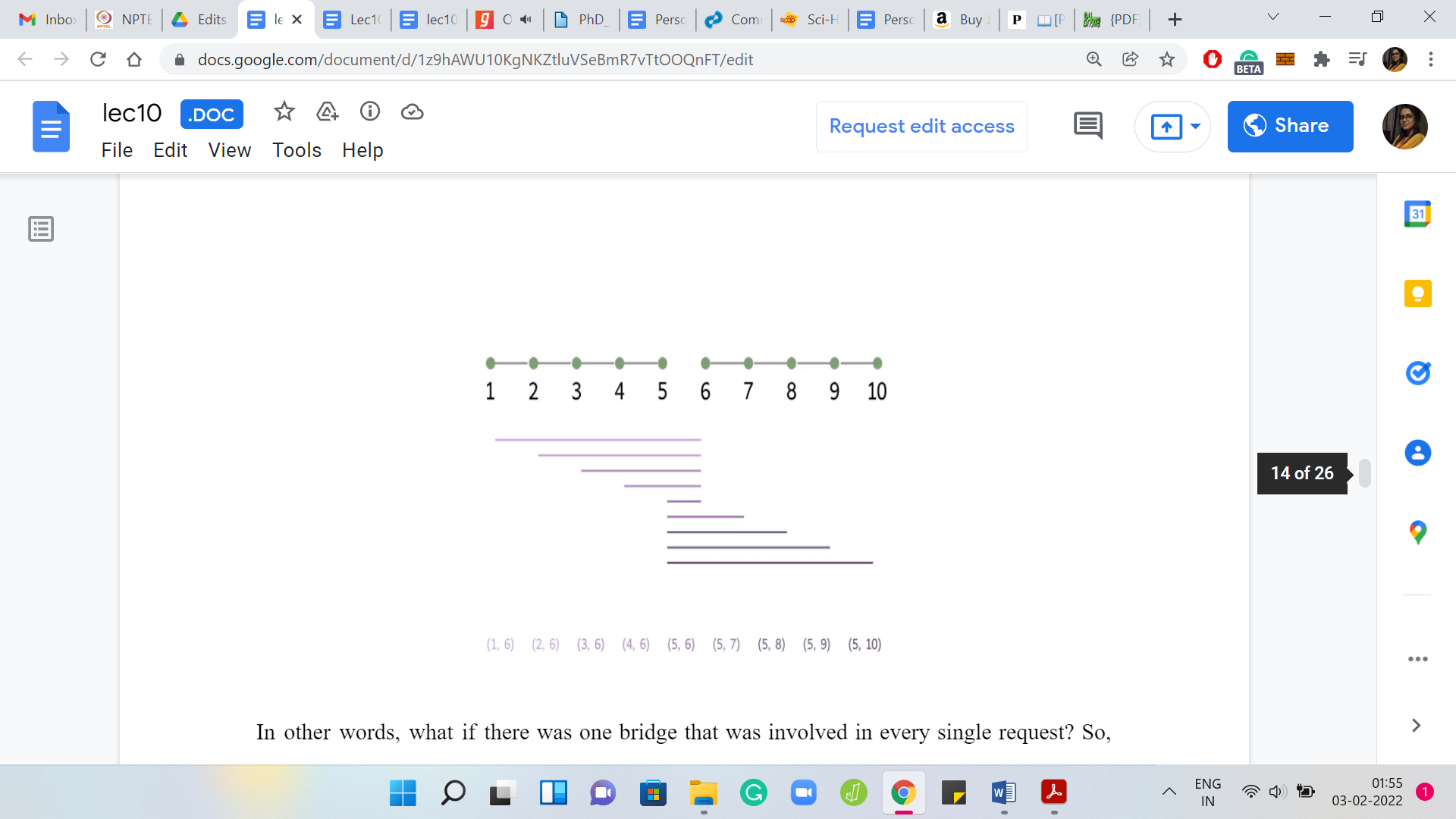 First, let us think about what if all the requests were disjoint? In this case, you know that there is no bridge that can handle more than one request. You know that the optimal solution must involve at least as many bridges as there are requests. So, ‘opt’ is actually equal to ‘m,’ in this case. In terms of actually coming up with a solution, if you had to, you could simply pick one bridge per request, and it could really be any bridge that kills that request. It would not matter.