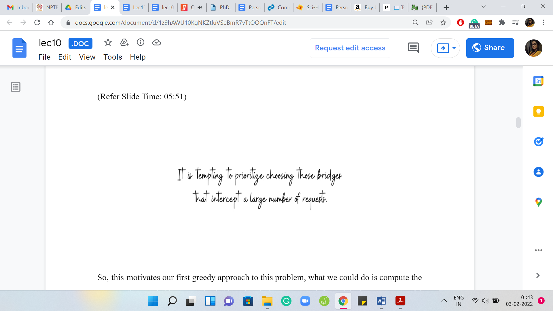 I will leave it to you to think a little bit about how you can implement this in a slightly different way to ensure that all your work is being done in just this one pass over the requests. One hint is that instead of actually explicitly eliminating requests as you go along, can you simply track the last bridge that you have included in your solution and for every request that you are going over, simply check as you go along, if it was handled by that last bridge or not and think about why this approach would also work?