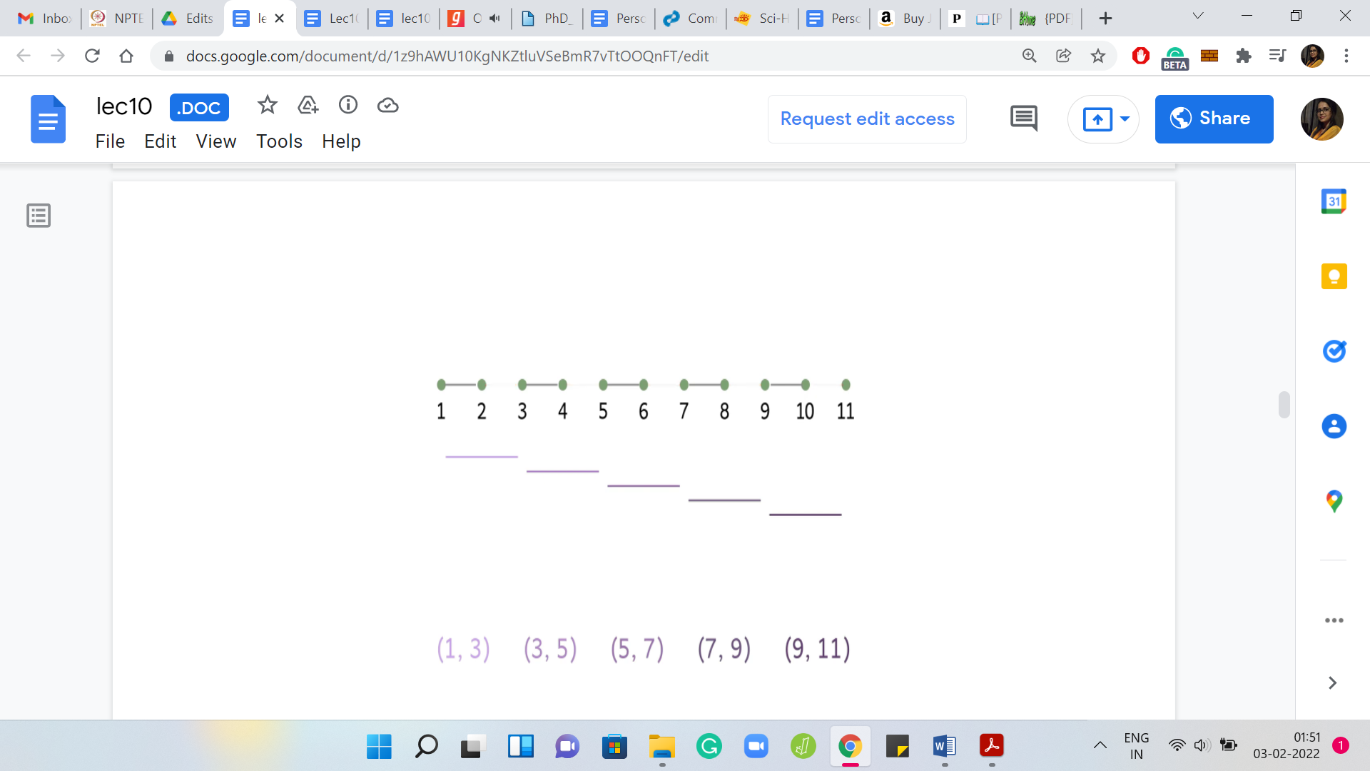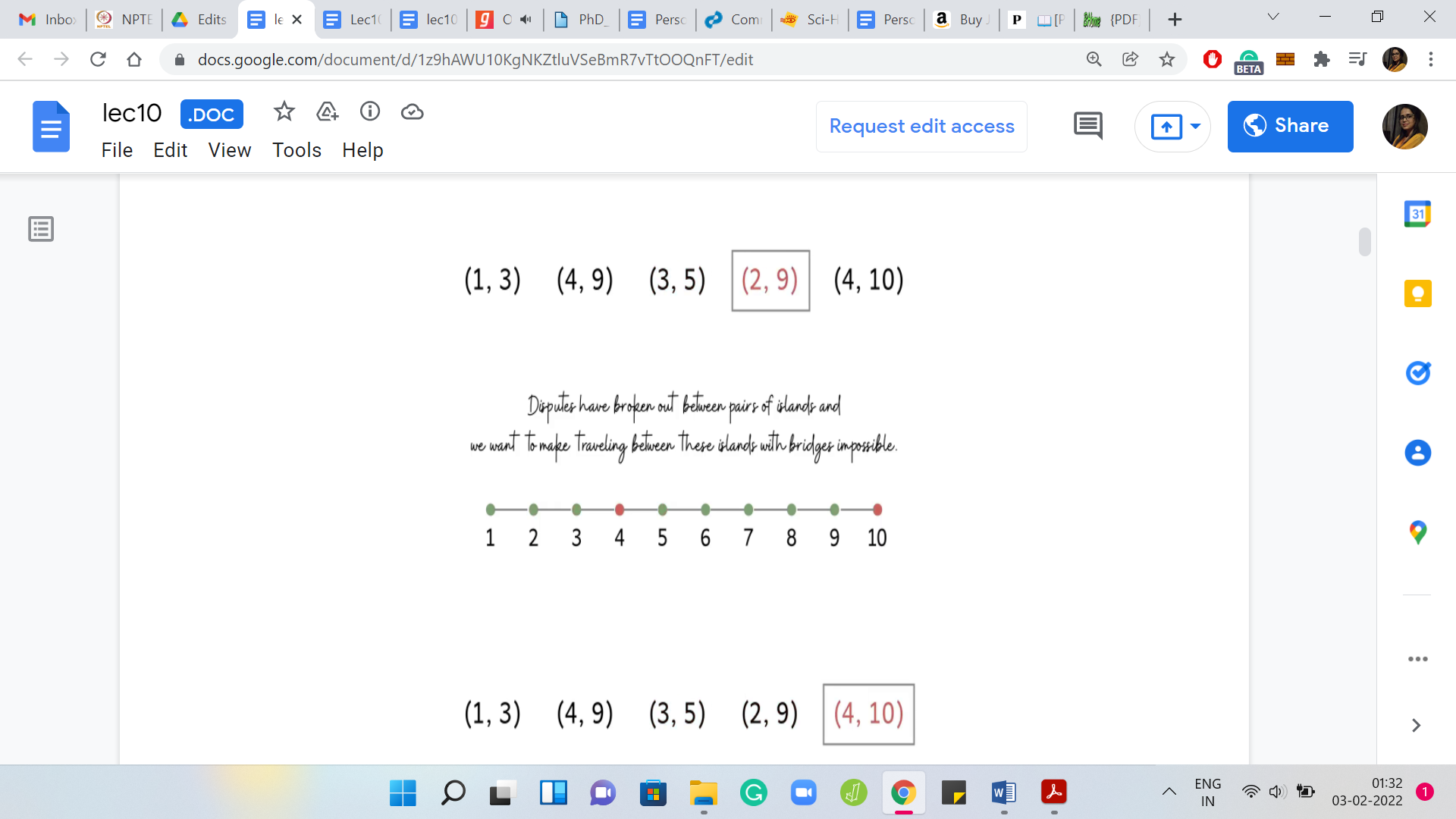 Let us declare an answer variable, which we initialize to 0. We will start looking at these requests and figure out if a request really demands that a bridge needs to be added to the solution. Let us start by going over the requests one by one. What do we need to know about this current request?