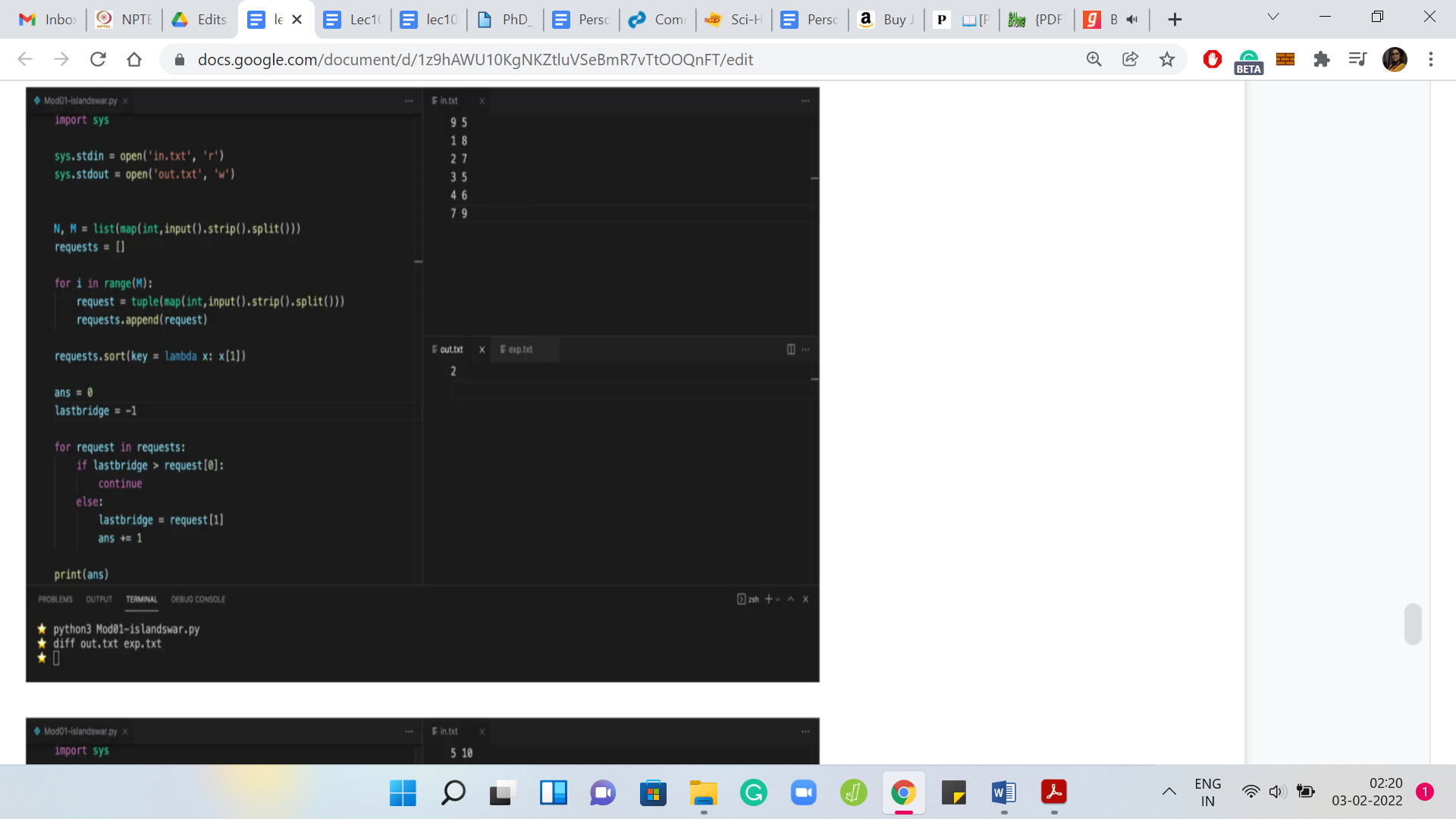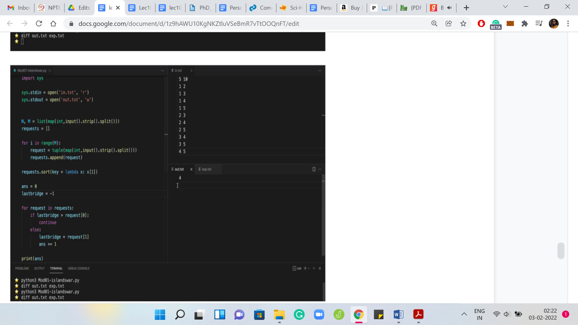 Let us go back and run our program and we will see that the output actually matches and everything seems fine. I think we should have some confidence from the fact that we have discussed our approach by now, in quite some detail. At this point, I would encourage you to actually check this code or a version of it that you might have put together on the full set of test cases and let us know how it went.