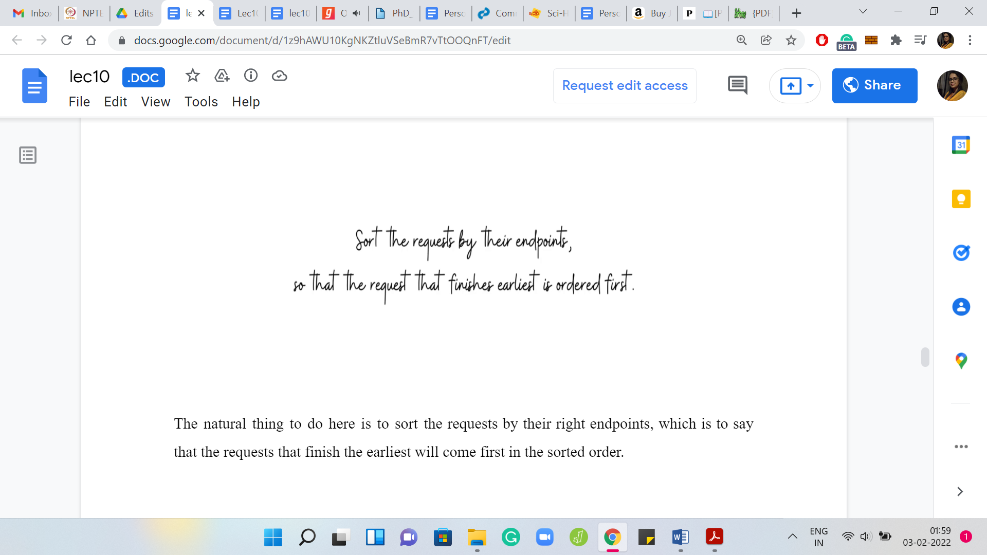 The first thing that we have to do is to sort this list of requests according to the right endpoint. What we are going to do is use the built-in sort function on the list of requests. But we also have to tell the ‘sort’ function to sort according to the second coordinate. There are many ways that we can do this.