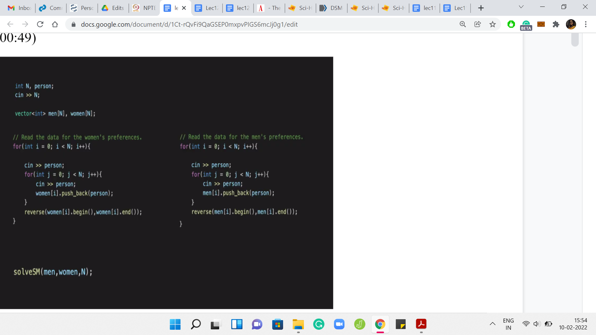 The first line is the first women’s preference, and it starts with a ‘1’ and is then followed by N integers between 1 to N in some order, which gives you the actual ranking. You have to remember to ignore this leading number. If you forget to do that, your algorithm is going to be all messed up. It is a very tiny detail, but just useful to note. That is why you have the stand-alone ‘cin’ person outside of the ‘for’ loop, which takes this input and does not really do anything with it. Then you read the rest of it into a vector.