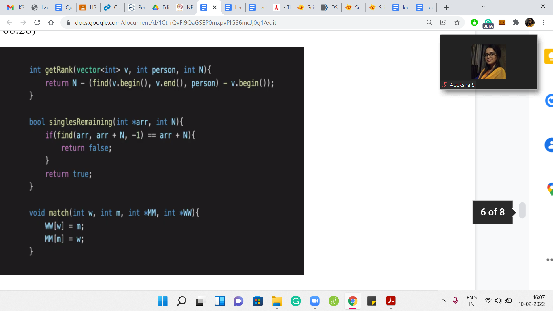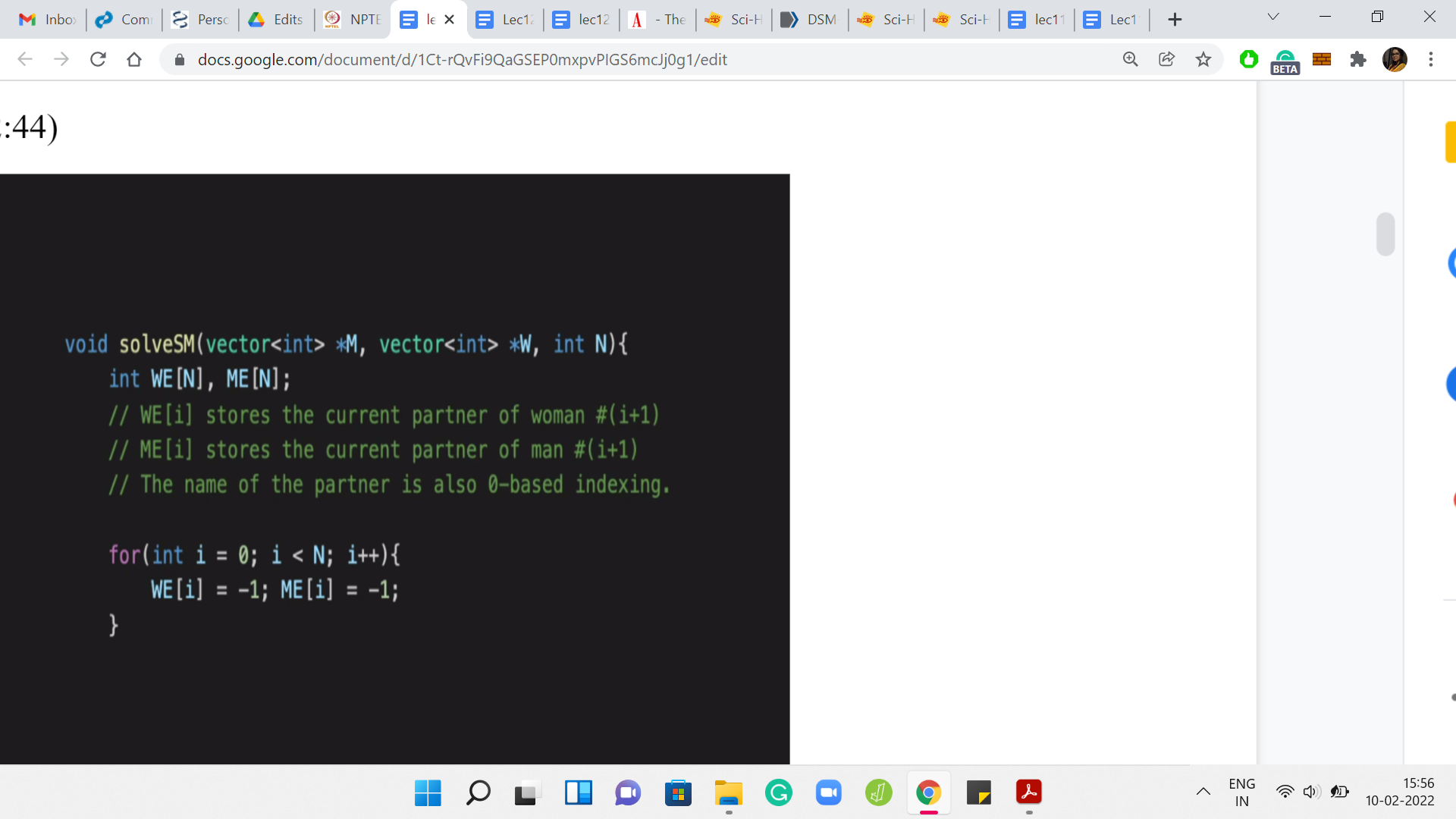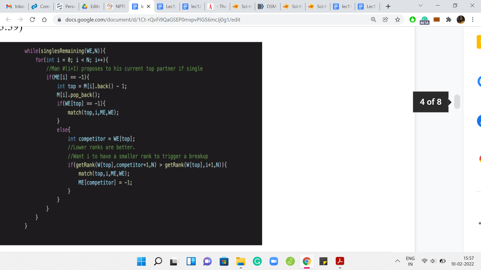 Remember that smaller ranks are going to be better. That is how the helper function is set up. If the man ‘i+1’ has a lower rank, then that means that the current engagement needs to be broken, and the previous person that ‘top’ was engaged to, we need to signify that he is back in the single spool of men. We make sure to set the competitors index in the ME array to -1 and we also make sure that man ‘i+1’ is matched with top. That is going to happen with this match helper function. So, that is essentially the heart of the algorithm.