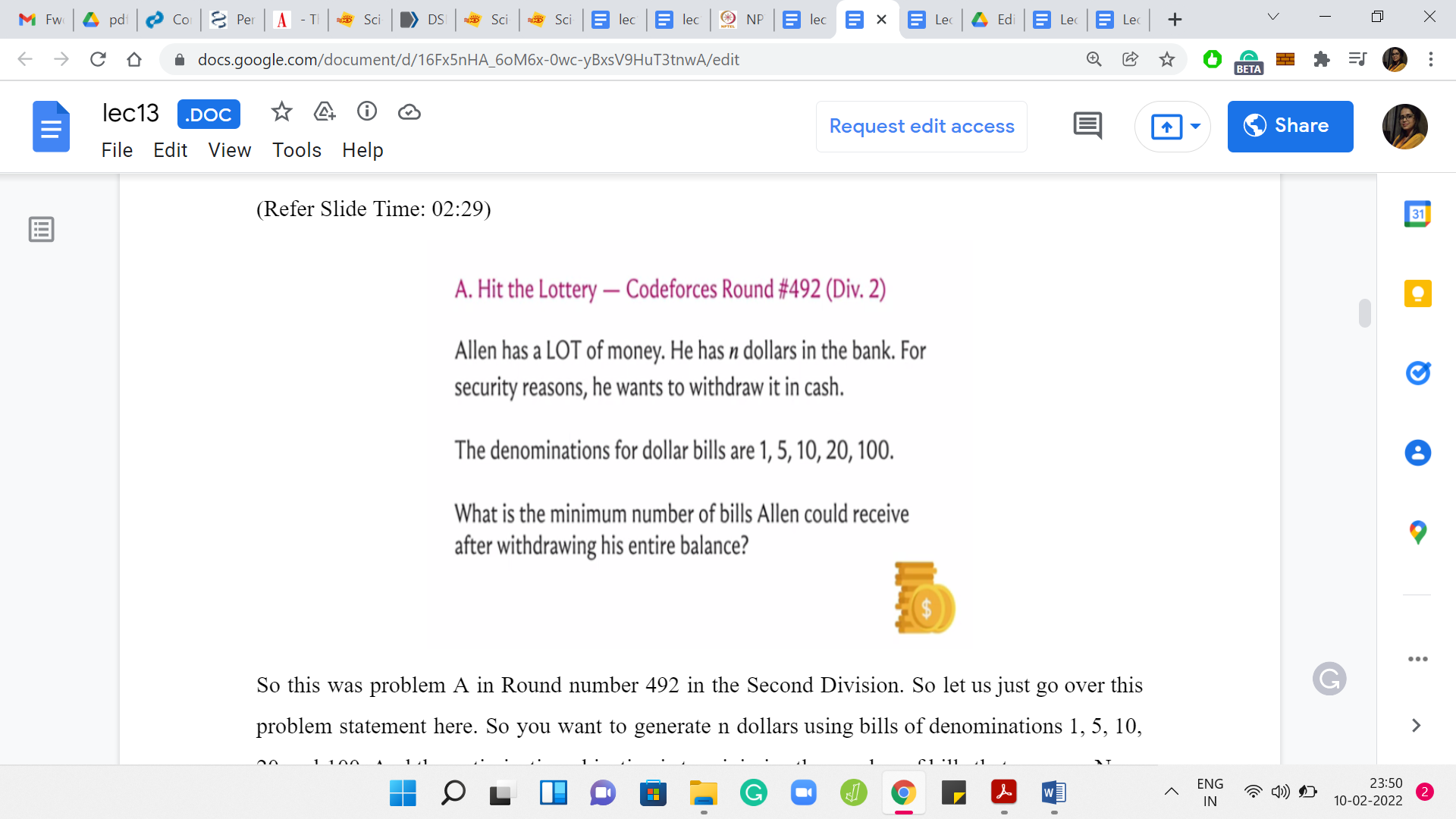 This was problem A in Round number 492 in the Second Division. Let us just go over this problem statement here. You want to generate n dollars using bills of denominations 1, 5, 10, 20, and 100. The optimization objective is to minimize the number of bills that you use. It turns out that, here, the natural greedy strategy that you can think of actually does work. You might be thinking that there was a whole lot of false advertising at the start when I said, we would not be solving any contest problems and we will be looking at examples where ‘greedy’ does not work.