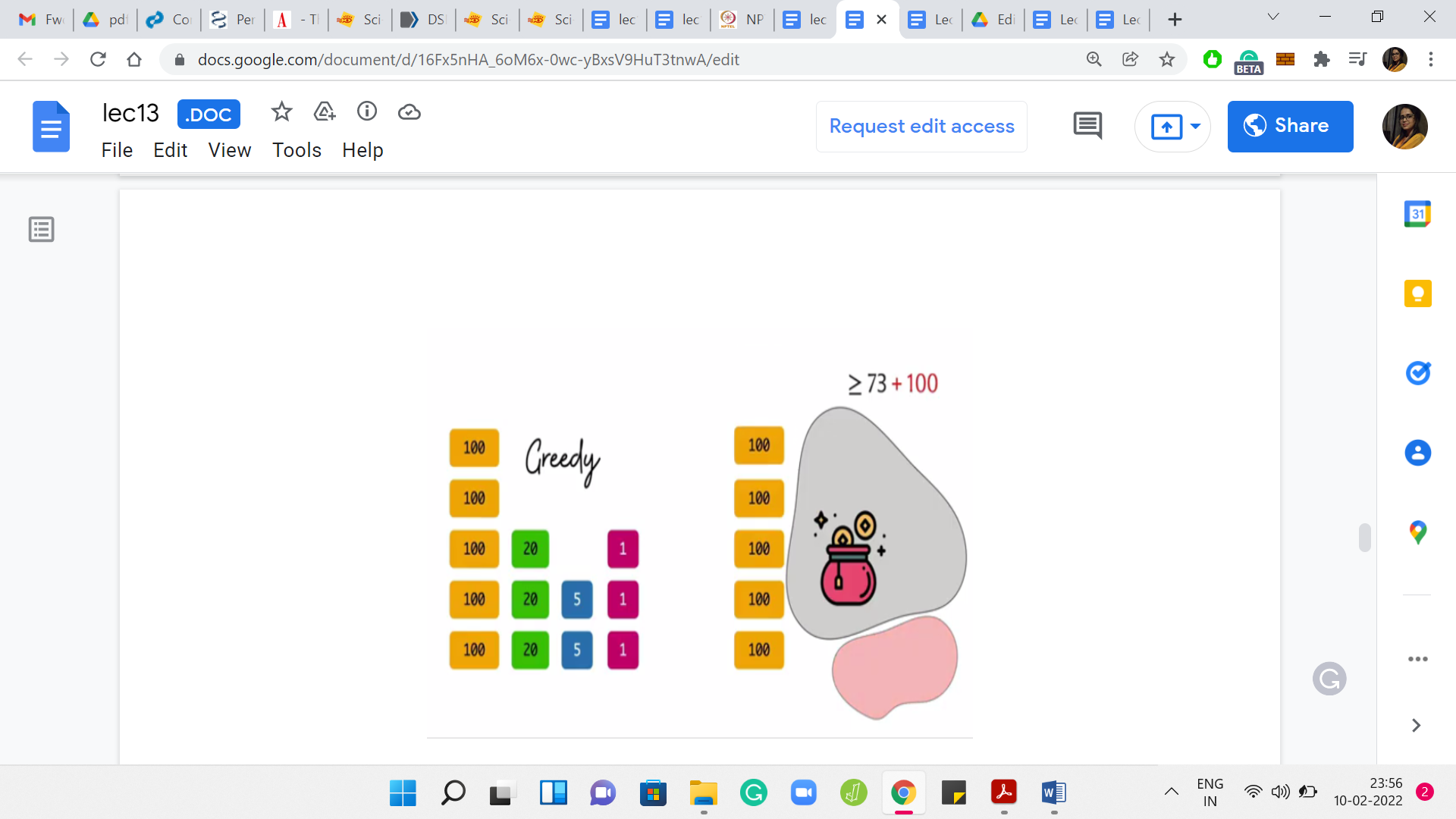 Now, I will not go through a complete and formal proof. But I will just try to convey some intuition for what is going on. Sometimes these coin systems for which the greedy algorithm does produce the right answer are called Canonical Systems. A property that these canonical systems have is that if you look at the larger denominations, they are always divisible by all of the smaller ones. For instance, here, 100 is divisible by 20, 10, 5, and 1. 20 is divisible by 10, and 5 and 1, and so on. Let us see why this property might be useful to us.
