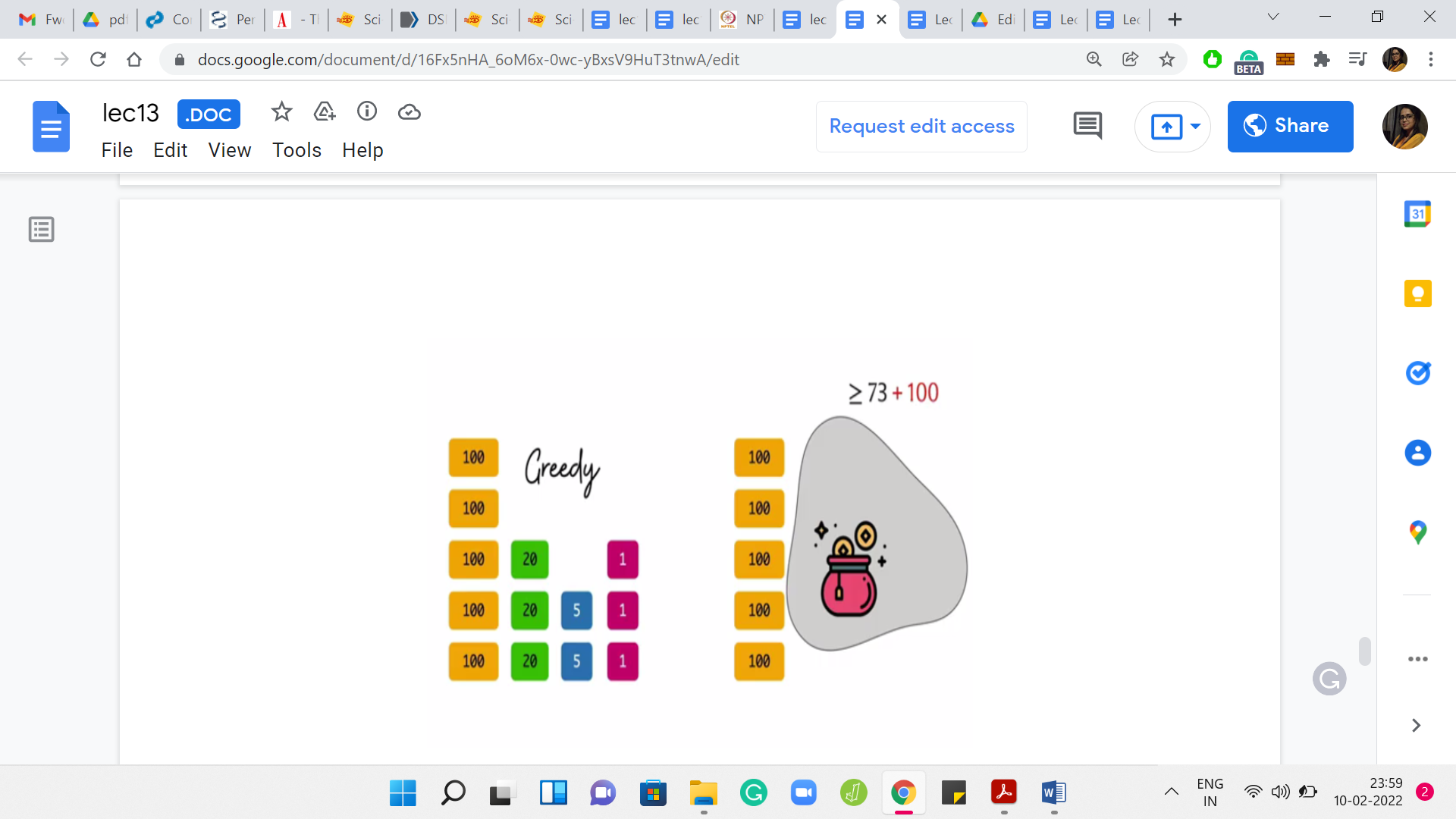 Notice that you can just keep using 100 dollar bills. You will have to use 100 of them to generate 10,000 and it should be visibly the best possible. That is what is going on with the greedy algorithm. Hopefully, the mechanics of ‘greedy’ are clear. But to see that this actually does always generate the smallest number of bills for this combination of denominations does require a bit of an argument.