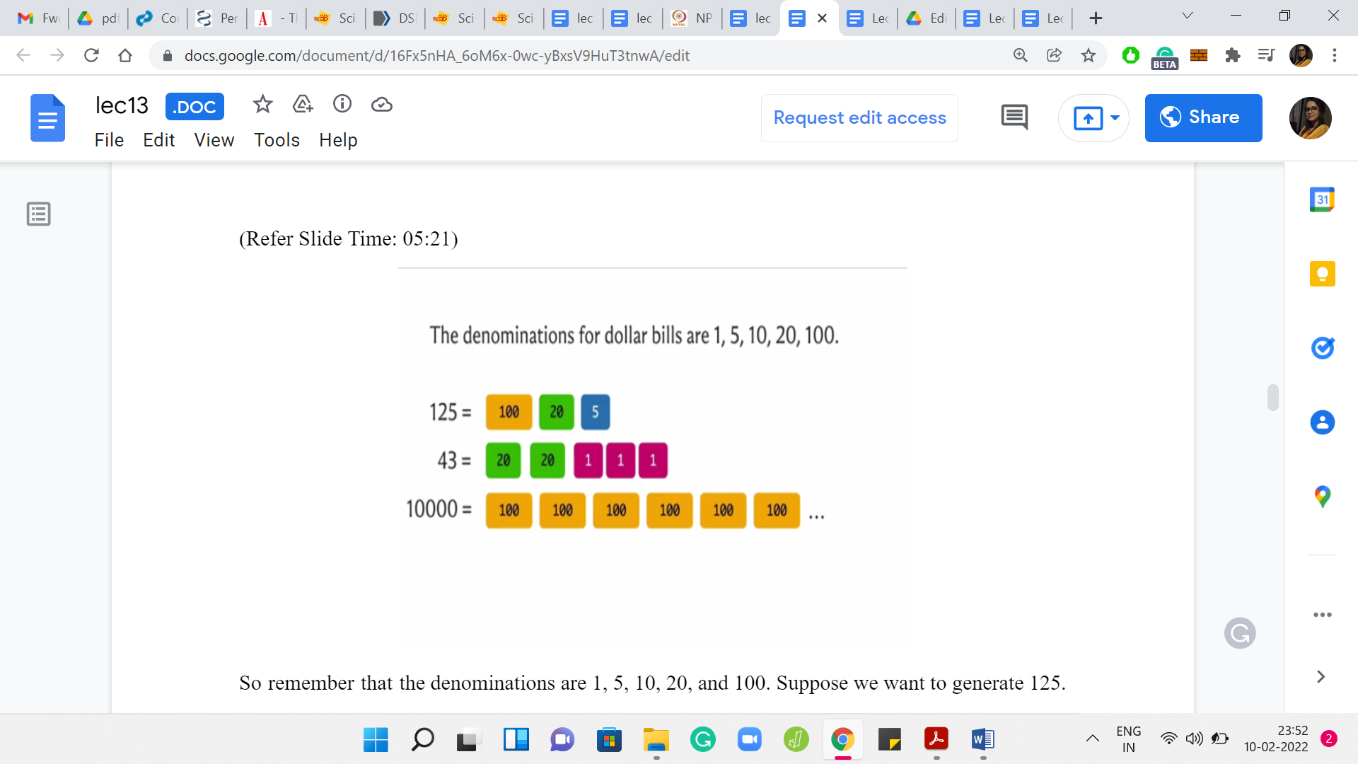 Here, essentially, imagine that you are trying to get some change for, say, 100 rupees, and you are at a cash counter. The cashier is trying to figure out how to generate 100 rupees from the notes that he or she has at his or her disposal at that time. It could be that you get two 50s, or you get three 20s and four 10s, or you get ten 10s or some such combination.