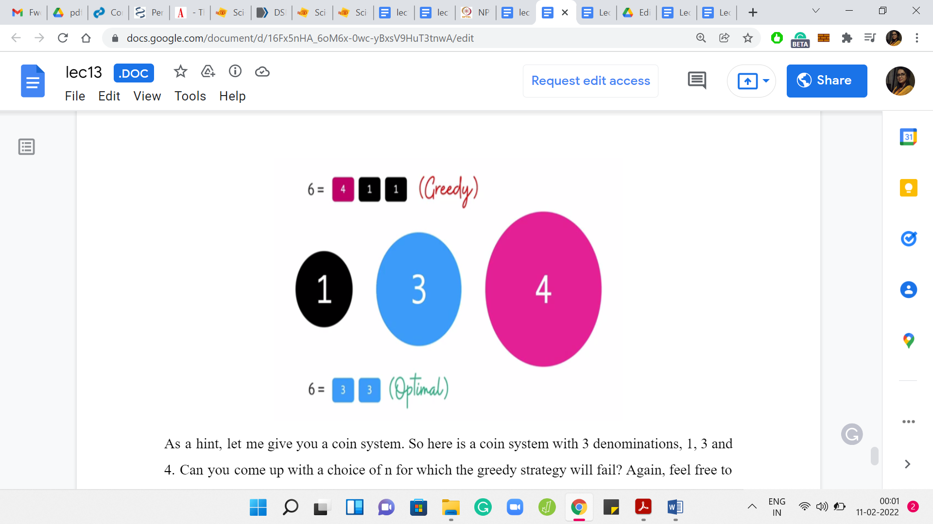 As a hint, let me give you a coin system. Here is a coin system with 3 denominations, 1, 3, and 4. Can you come up with a choice of ‘n’ for which the greedy strategy will fail? Feel free to pause here for a moment and try to work through this. Here is a value of ‘n’ for which greedy will fail. Suppose you try to generate 6, the greedy algorithm will try to do its maximum leverage backing.