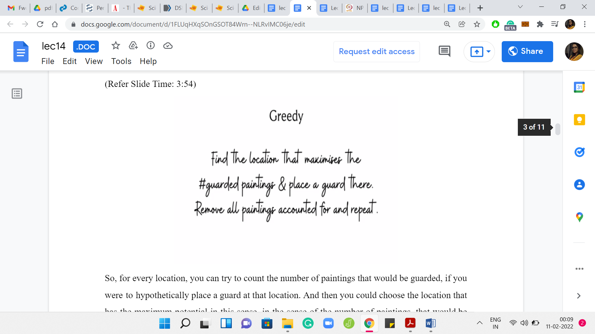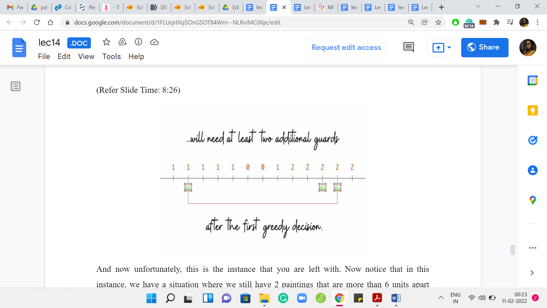 Because of this situation, we see that the greedy algorithm will need to have 2 more guards on top of the very first guard that it has already positioned, leading to a sub-optimal answer. You might think that it was because of an unlucky tie-break. Correct. There was at least one way of breaking the tie. I think there are at least 2 ways, which would have led to the correct answer.