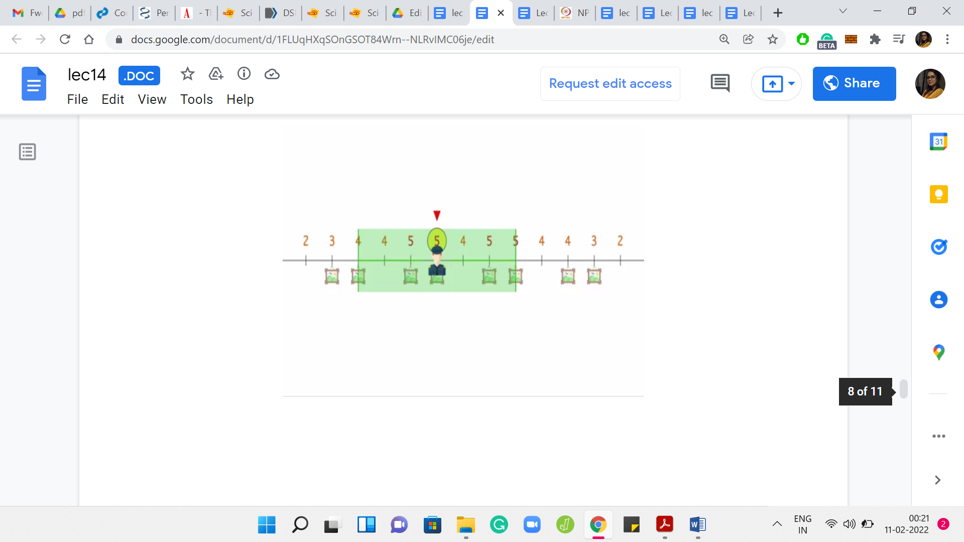 Here is an example with N = 8. We have 8 paintings at various locations. Let us say the visibility ranges of the guards are 3. So, K = 3. We are basically computing the potential of each location. This number is written above each location. You can pause the video here for a minute and verify that these numbers are as you would expect. Let us now think about what the greedy algorithm would do.