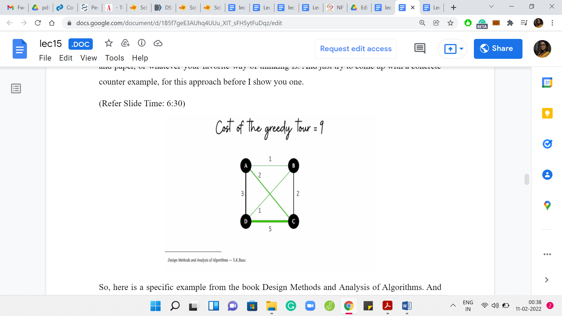 Here is a specific example from the book ‘Design Methods and Analysis of Algorithms.’ If you look at the costs here, let us just try to run through what would happen if we applied the greedy algorithm with the origin city being the city on the top left, which is the city labeled A. From A, the most accessible city is B, and it is a cost of ‘one’ to go there. From B, you have two possibilities, you could go to D or C. It is cheaper to go to D. That is what we will do next.