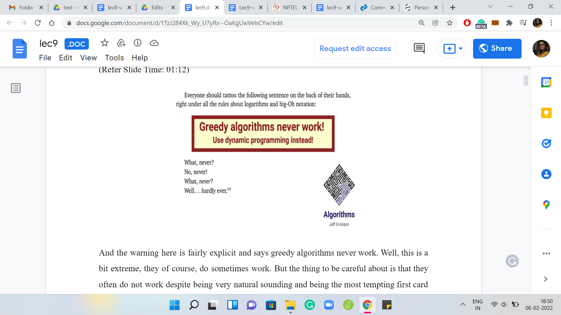 The warning here is fairly explicit. It says greedy algorithms never work. Well, this is a bit extreme, they, of course, do sometimes work. But the thing to be careful about is that they often do not work despite being very natural sounding and being the most tempting first card approach to a problem. So, for most optimization problems, you will probably naturally come up with a greedy style or a greedy approach to it, which by the way, is essentially characterized by doing whatever you need to do with minimal effort. Whatever seems like the right thing to do, in the moment. I really do not know of a formal definition of what makes an algorithm greedy. Although there are some really interesting mathematical formalisms around characterizing when a greedy algorithm will actually work. If you are really interested in this, then the thing to look up is matroid structures.