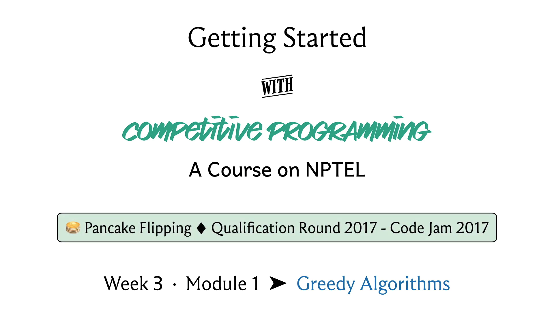 Welcome back to the third week of ‘Getting Started with Competitive Programming.’ I hope that you are excited about exploring a new theme. In this week, our focus will be completely on greedy algorithms. So, greedy is a fairly broad algorithms design, paradigm, or technique and it is fairly popular in contest programming.