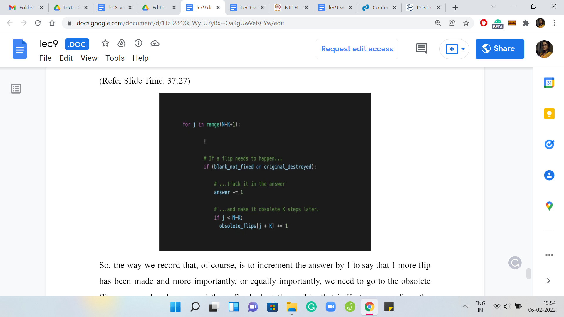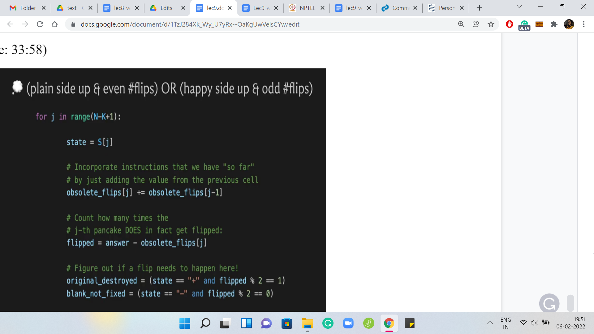 The obsolete flips variable needs to be appropriately incremented, as I said, you could also just increment all the values for obsolete flips for all larger indices. But that would be very expensive to do. We are not doing that and instead, we do the trick of borrowing a previous value as we did at the start of this ‘for’ loop. That is essentially the first part.