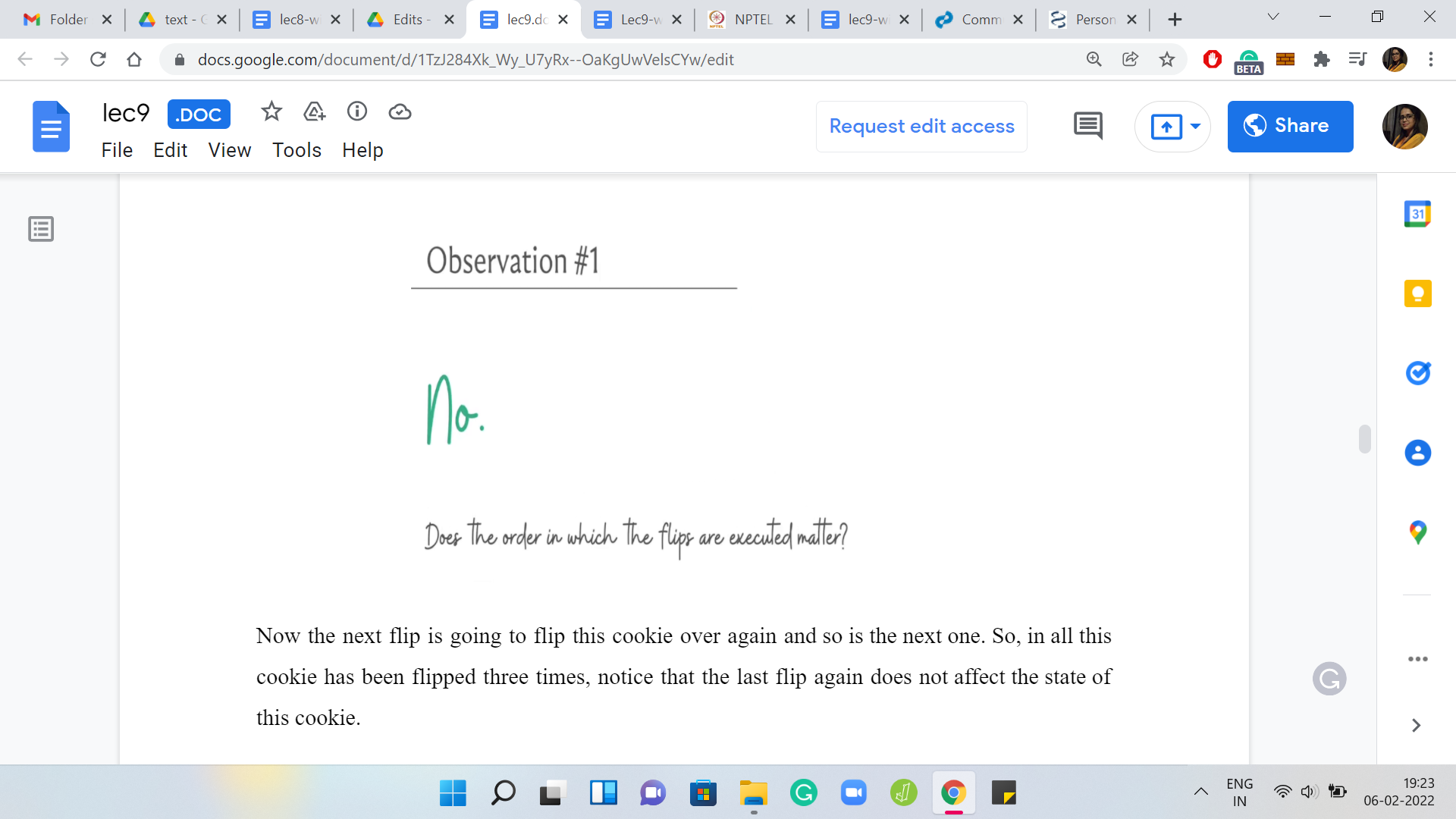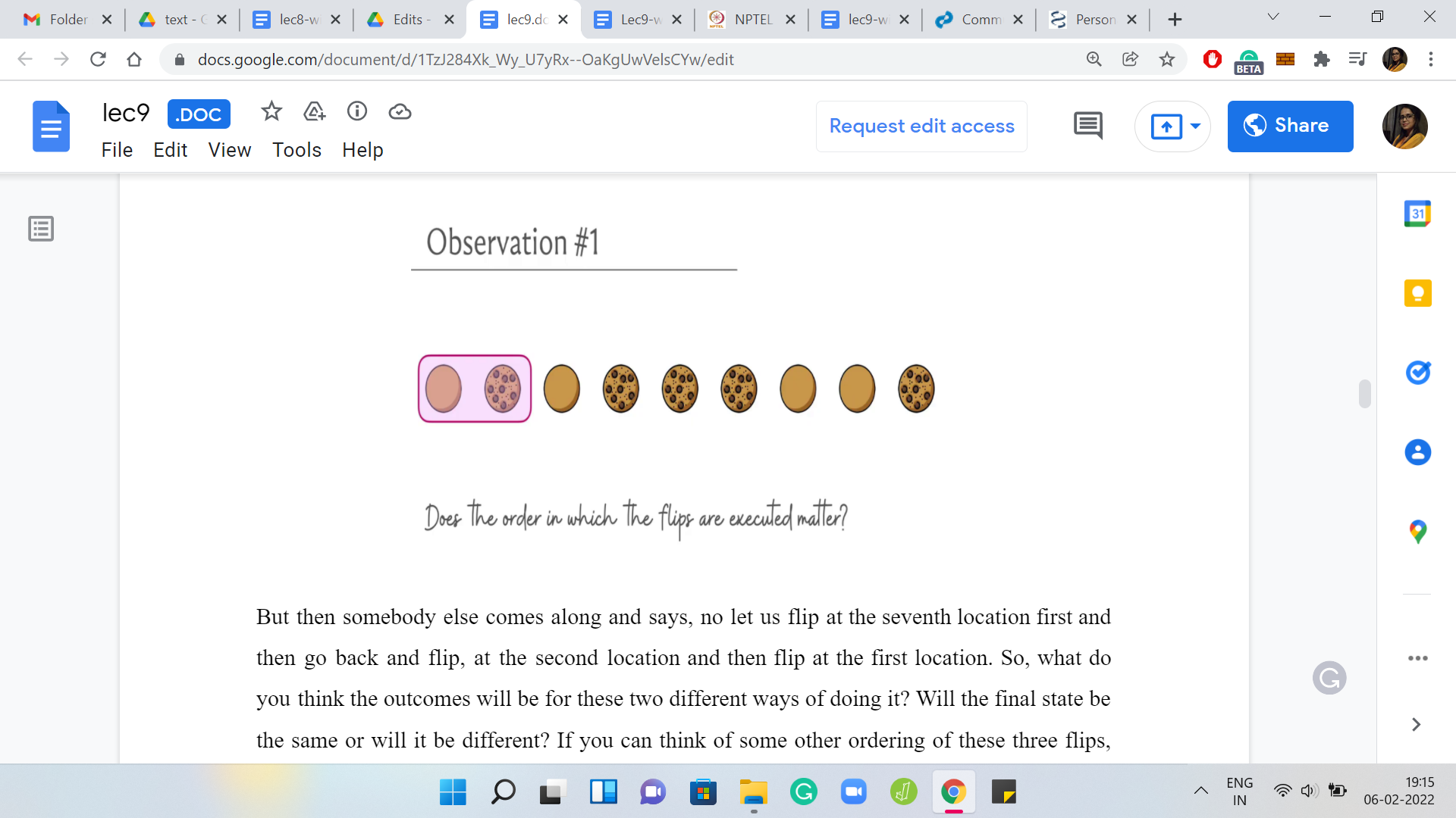At the end of the day, this particular cookie was flipped three times and that is going to be true no matter what order you perform the flips in. Hopefully, that is clear. Notice also that there was nothing special about the sixth cookie in this list. Whatever we said is true for every single one of them. Therefore, no matter what the order is in which you perform a set of flips, the final outcome is going to be the same, so the order does not matter.