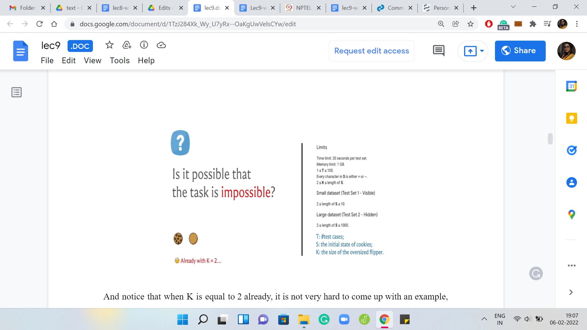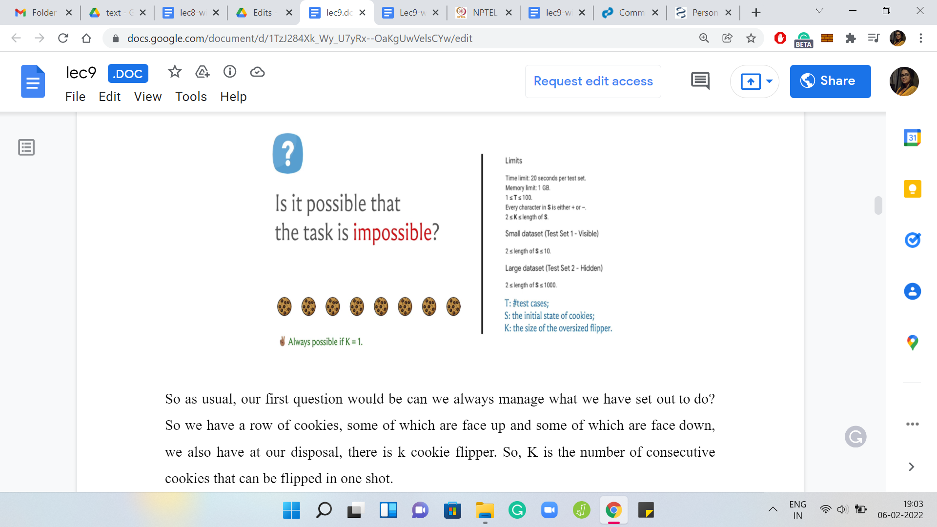 That is the mechanics of the problem, hopefully, clear at this point. The question I am asking is, can we always do this? I have for your reference the limits that are given in the problem statement. Let us just go over a little bit of notation. The initial state of all the cookies is given by a string S and the encoding is that it is a ‘+’ if it is initially face-up, and it is a ‘-’ if it is initially face-down.