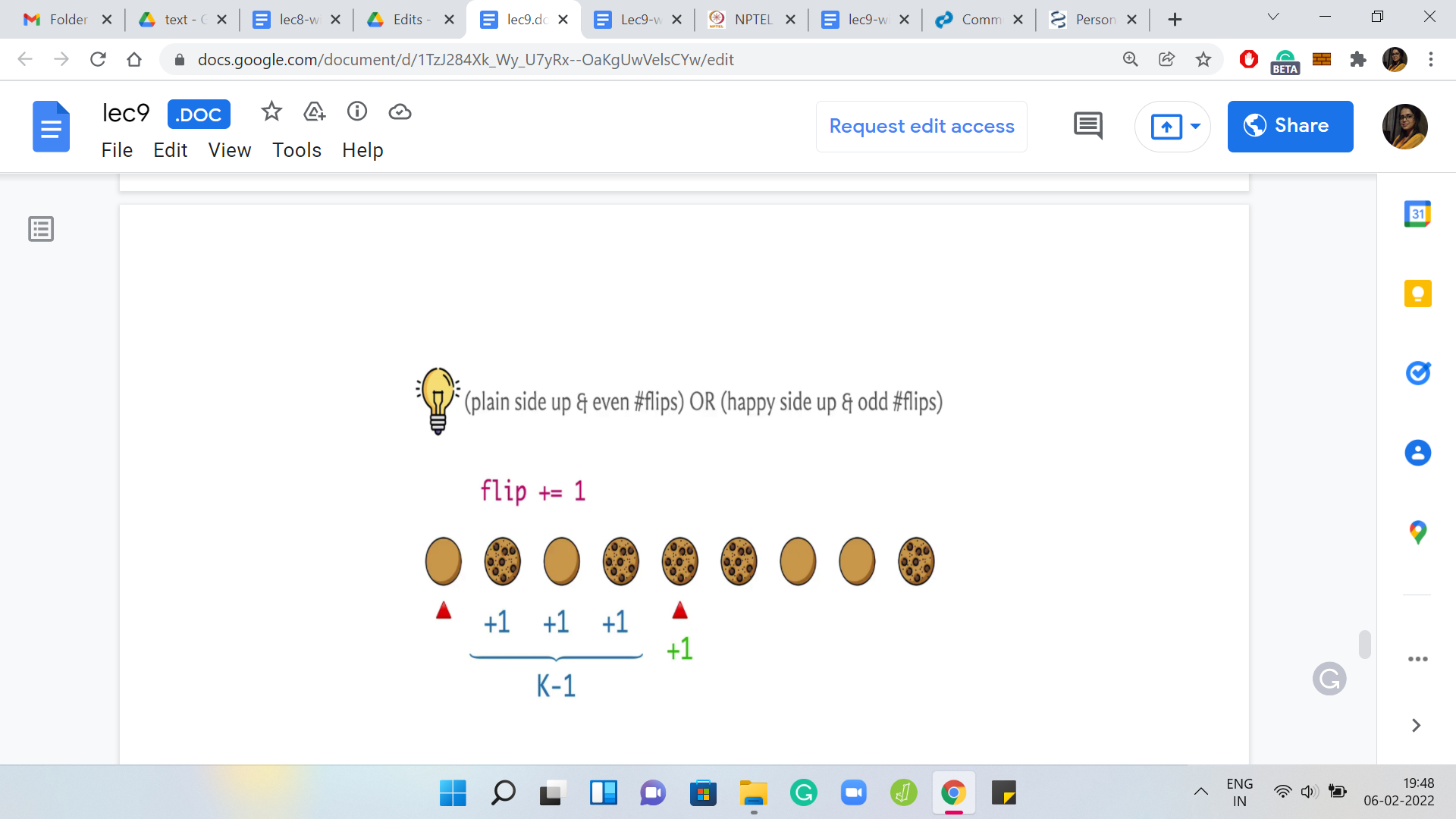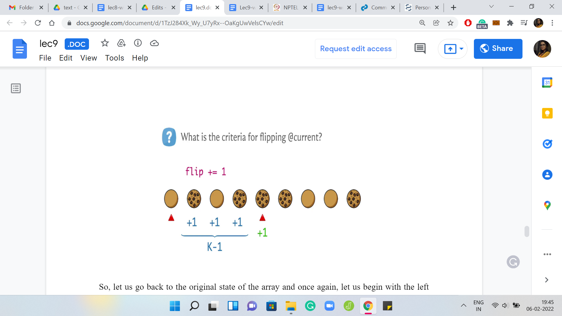 Notice that we really want to avoid having to do something ‘K’ times or ‘K-1’ times or whatever. Think about what is it that we really need to know. When we are processing the cookie at the jth location for some ‘j,’ what we really need to know is: How many times is this cookie been flipped so far? A hint to that is in the flip variable - the flip variable tells us how many flips have happened so far.